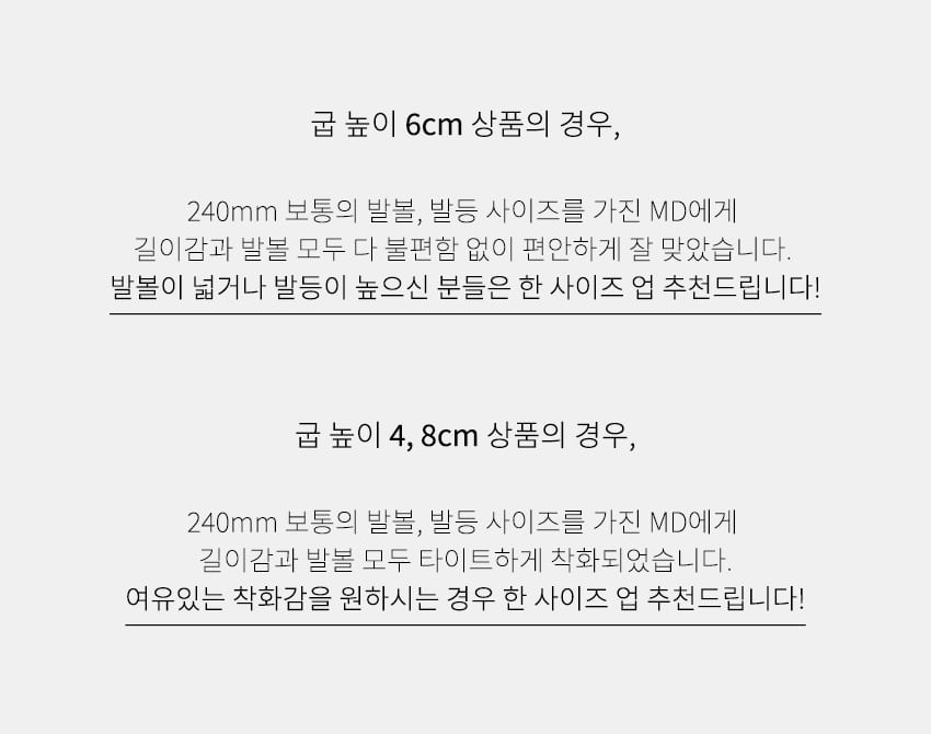 상품의 상세사이즈를 참고하여 평소 신으시는 신발과 실측 비교해보시는 것을 추천드립니다.