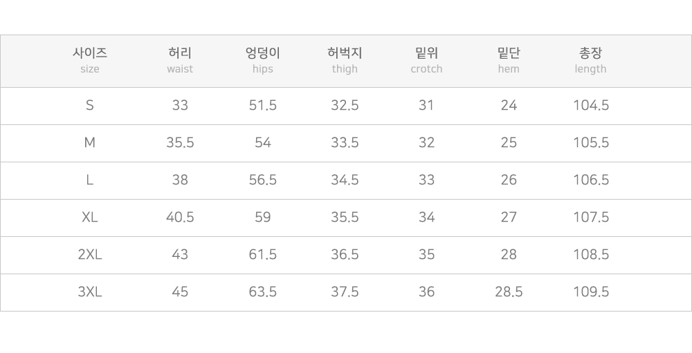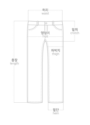 | 사이즈 | 허리 | 힙 | 밑위 | 허벅지 | 밑단 | 총길이 |