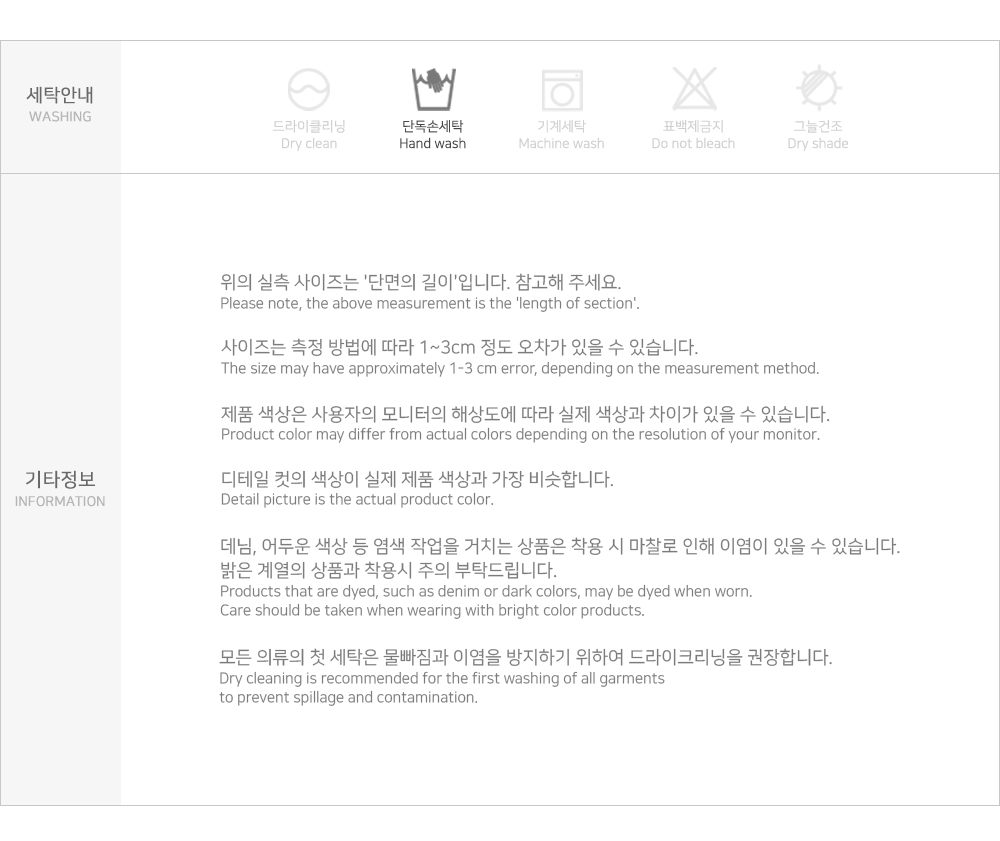 · 모든 의류의 첫 세탁은 드라이크리닝을 추천하며, 세탁 후 착용 부탁 드립니다.