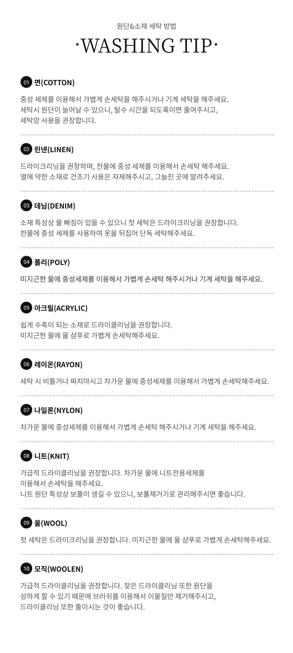 · 데님 및 컬러 제품은 이염 방지를 위해 단독 세탁을 권장합니다.
