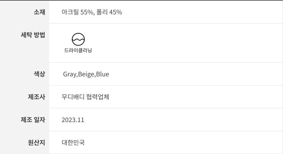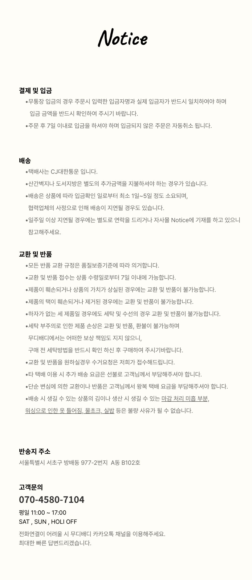 · 모든 의류의 첫 세탁은 드라이크리닝을 추천하며, 세탁 후 착용 부탁 드립니다.
