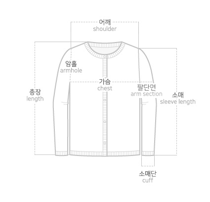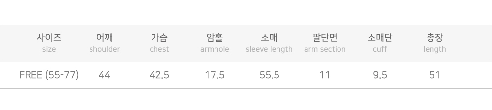 | 사이즈 | 어깨너비 | 가슴 | 팔길이 | 팔폭 | 총길이 |