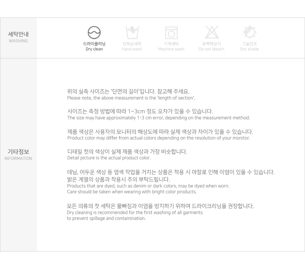 · 모든 의류의 첫 세탁은 드라이크리닝을 추천하며, 세탁 후 착용 부탁 드립니다.