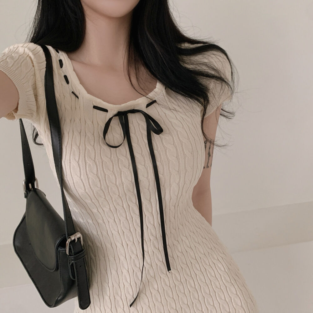 딥한 스퀘어넥으로 쇄골라인을 여리여리하게 연출해주고 ,