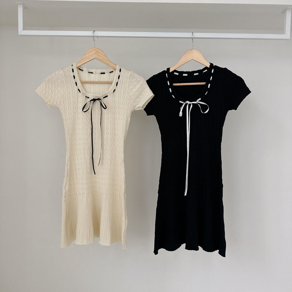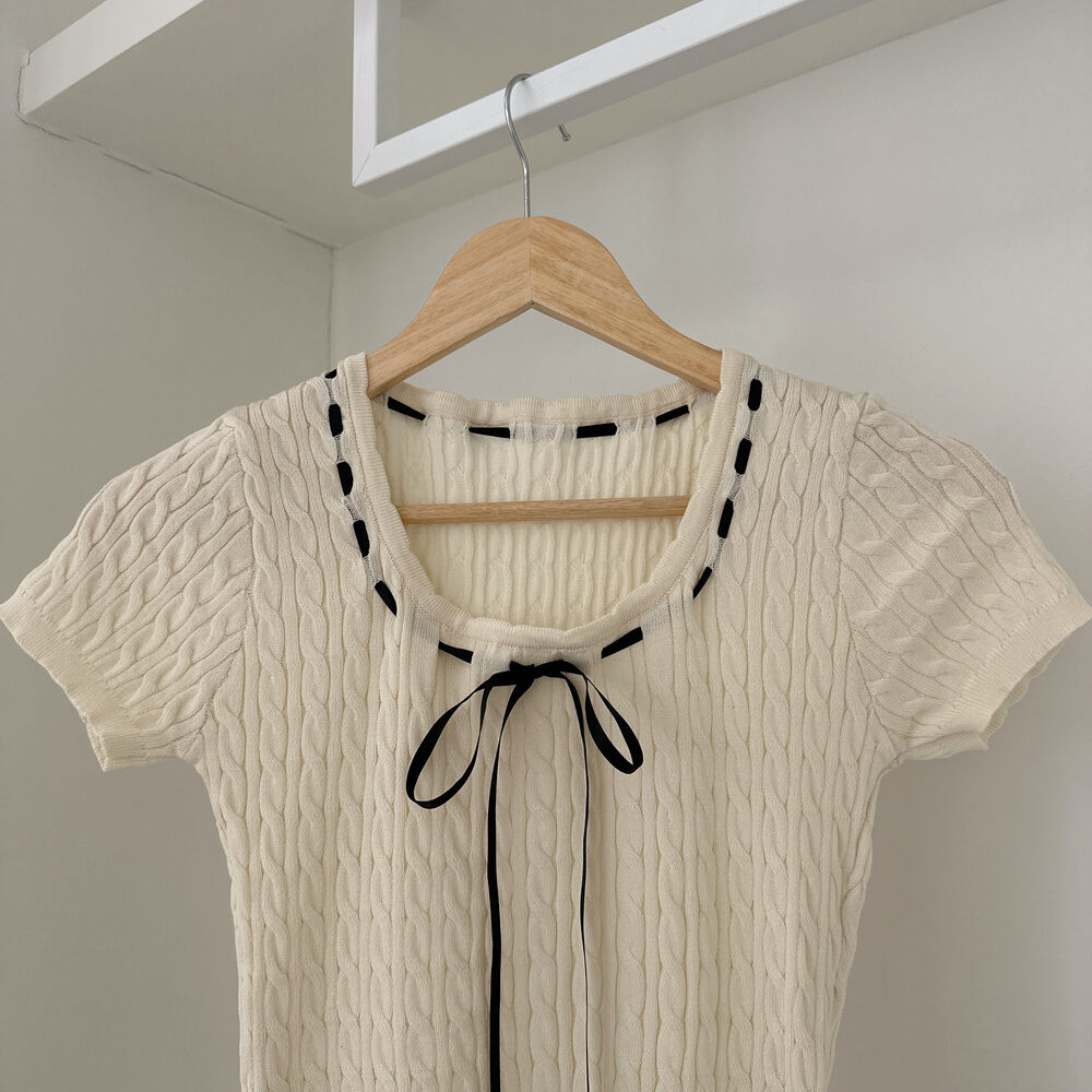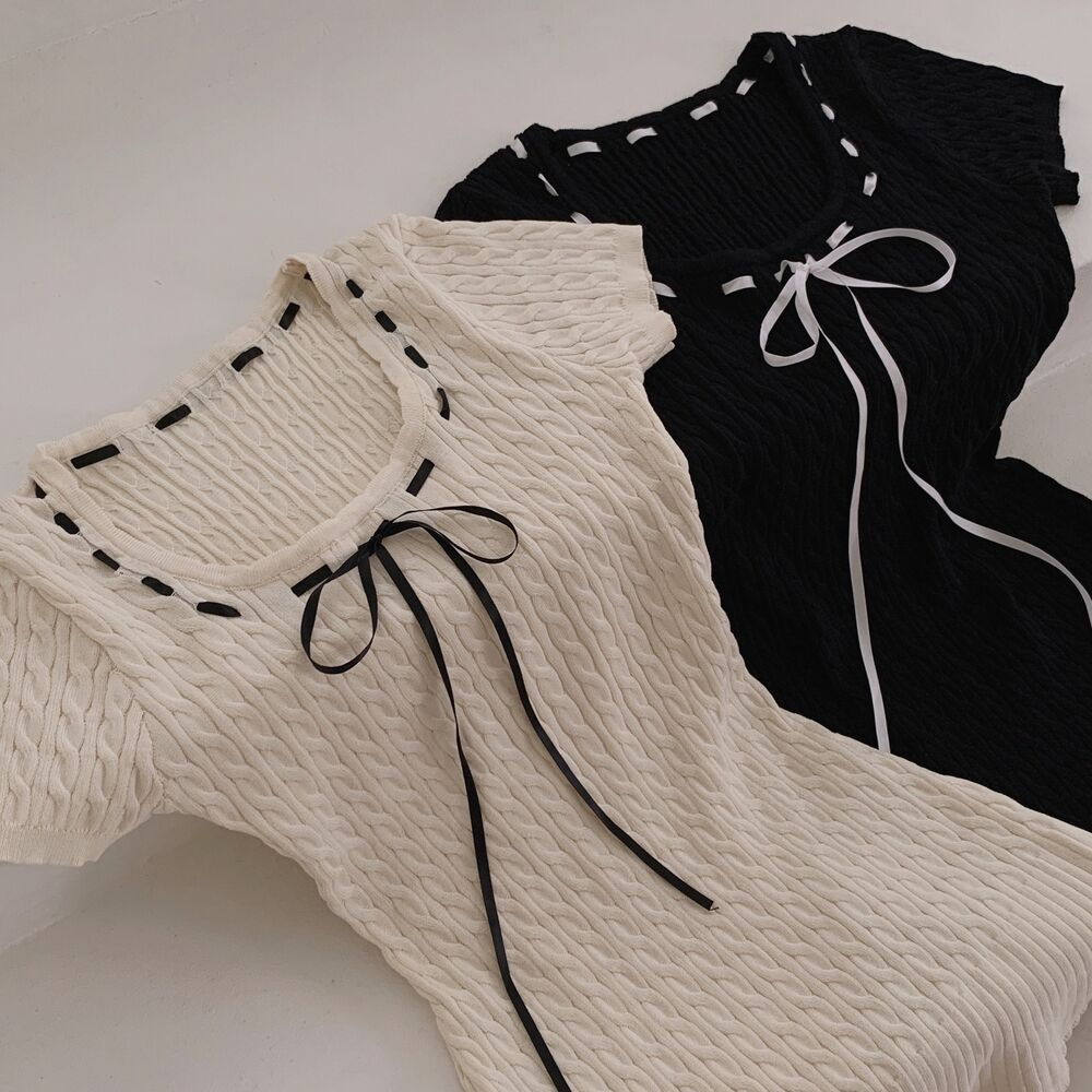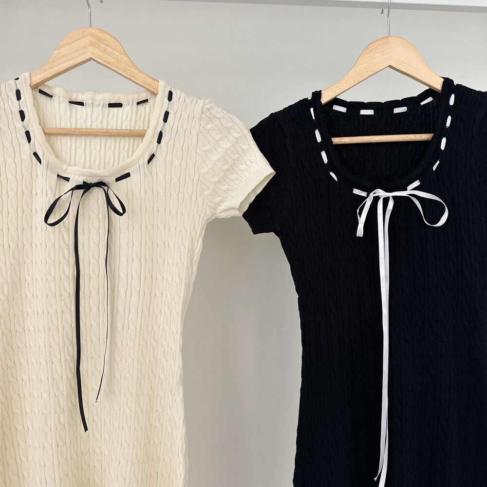 넥라인 스티치 디테일과 리본 포인트로 밋밋하지 않는 포인트!