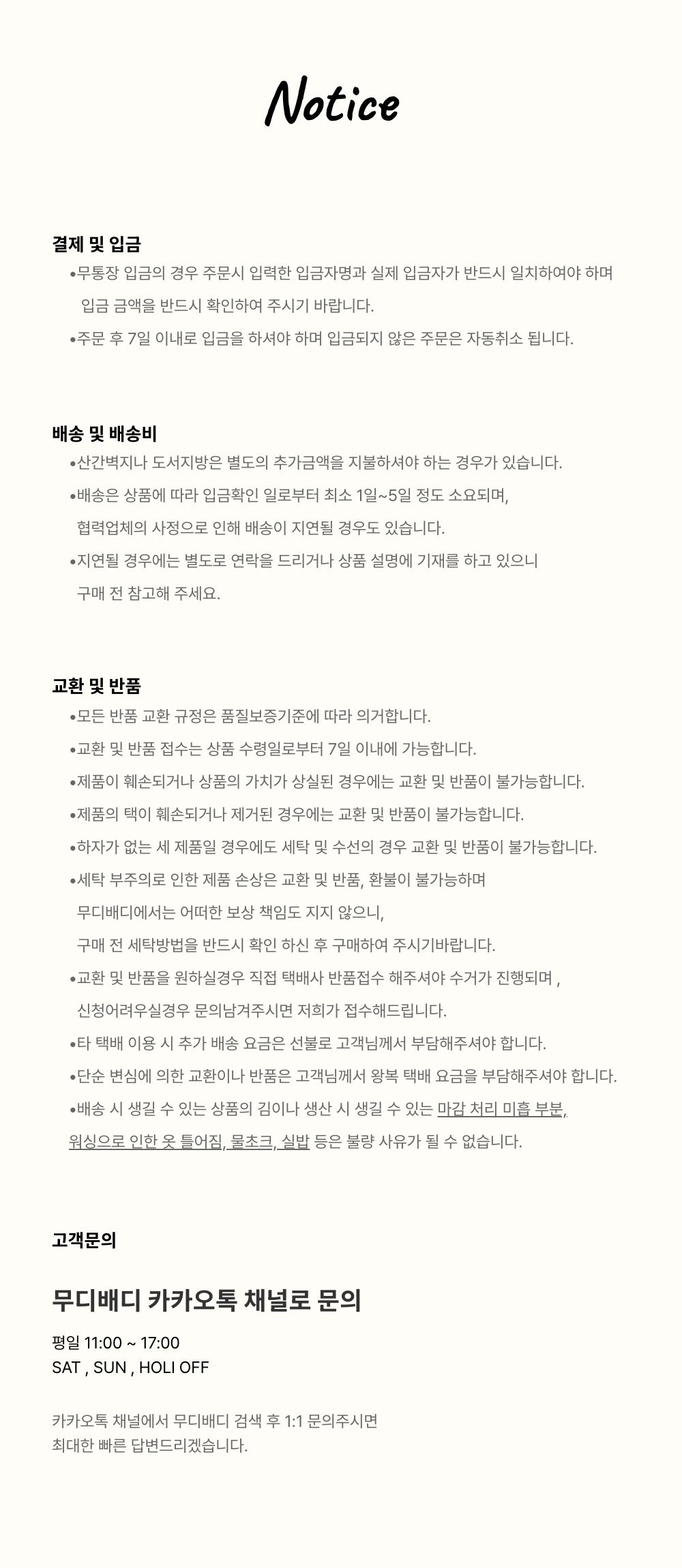 · 모든 의류의 첫 세탁은 드라이크리닝을 추천하며, 세탁 후 착용 부탁 드립니다.