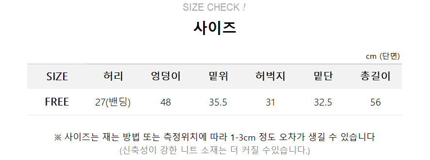 | 사이즈 | 허리 | 힙 | 밑위 | 허벅지 | 총길이 |