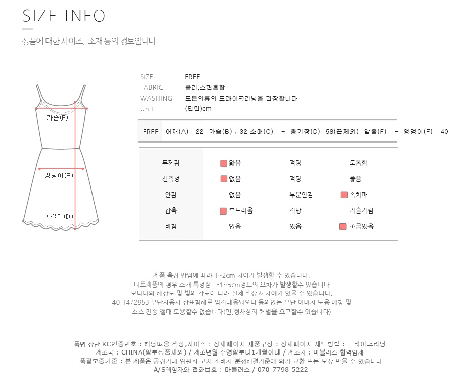 FREE 어깨(A) : 22 가슴(B) ; 32 소매(C) : - 총기장(D) :58(끈제외) 암홀(F) : - 엉덩이(F) : 40