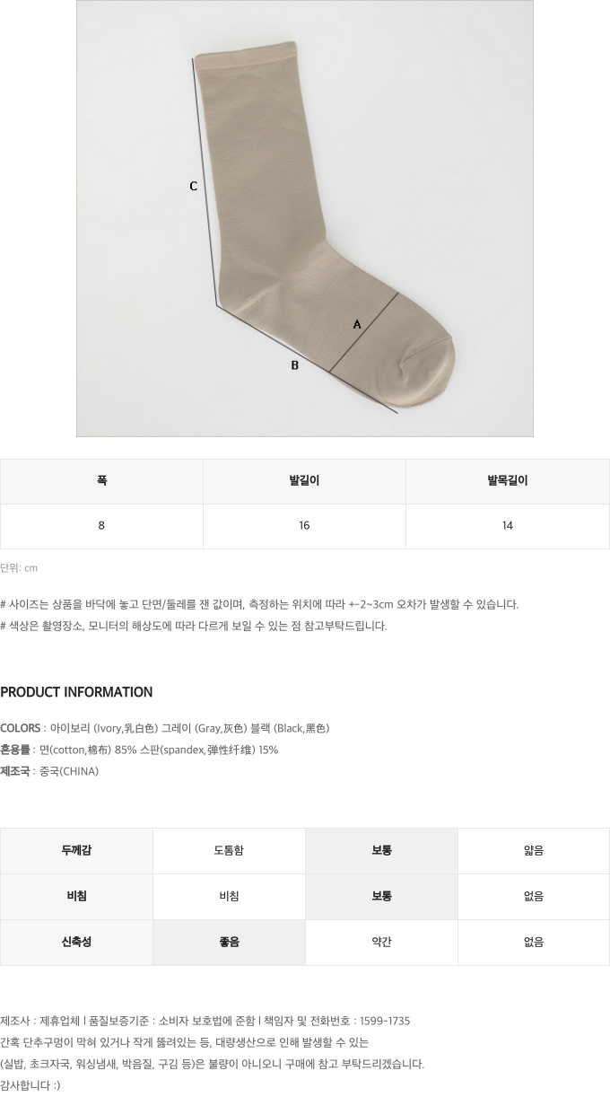 • 혼용률 : 면(cotton,棉布) 85% 스판(spandex,弹性纤维) 15%