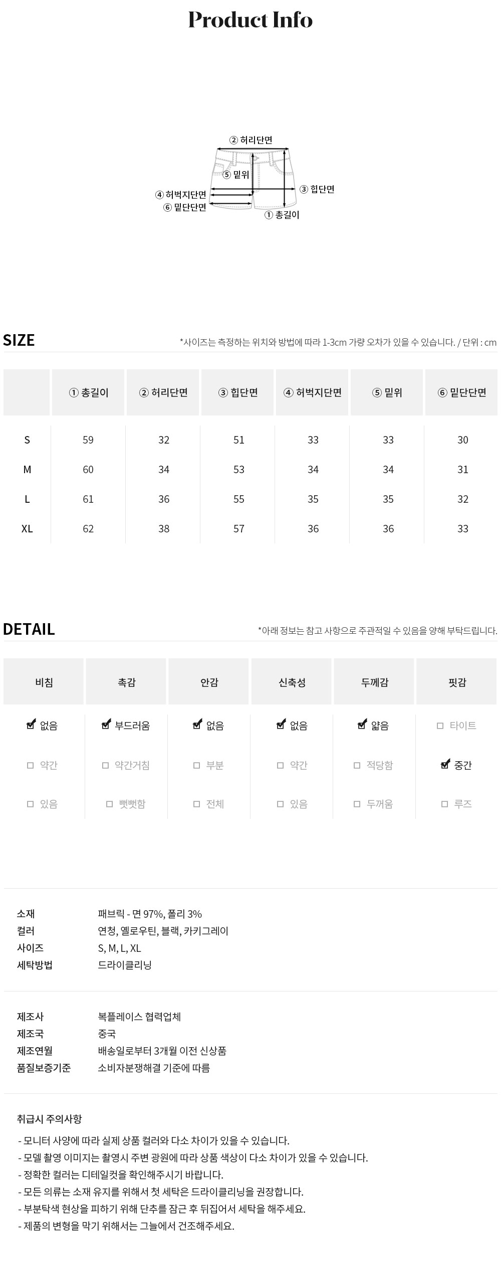 | 사이즈 | 허리 | 힙 | 밑위 | 허벅지 | 총길이 |