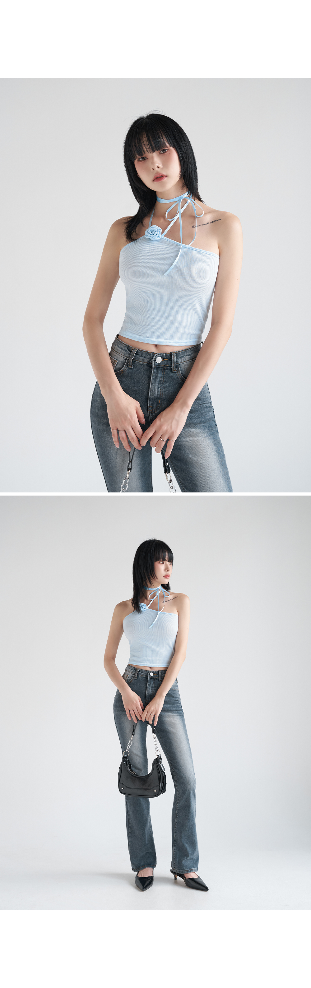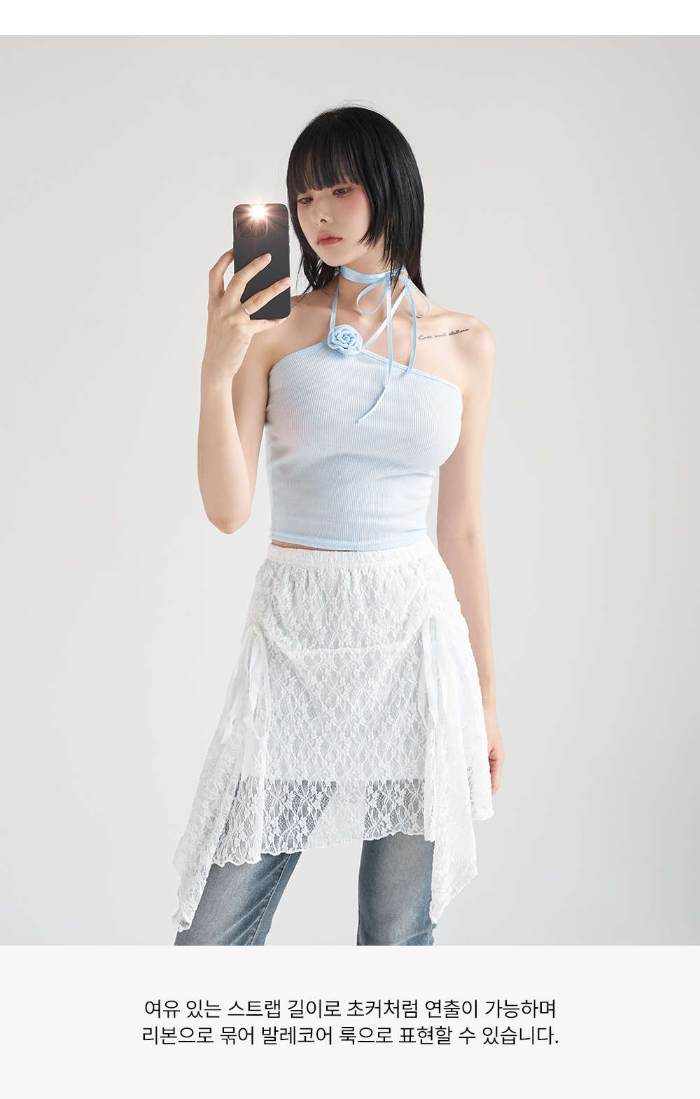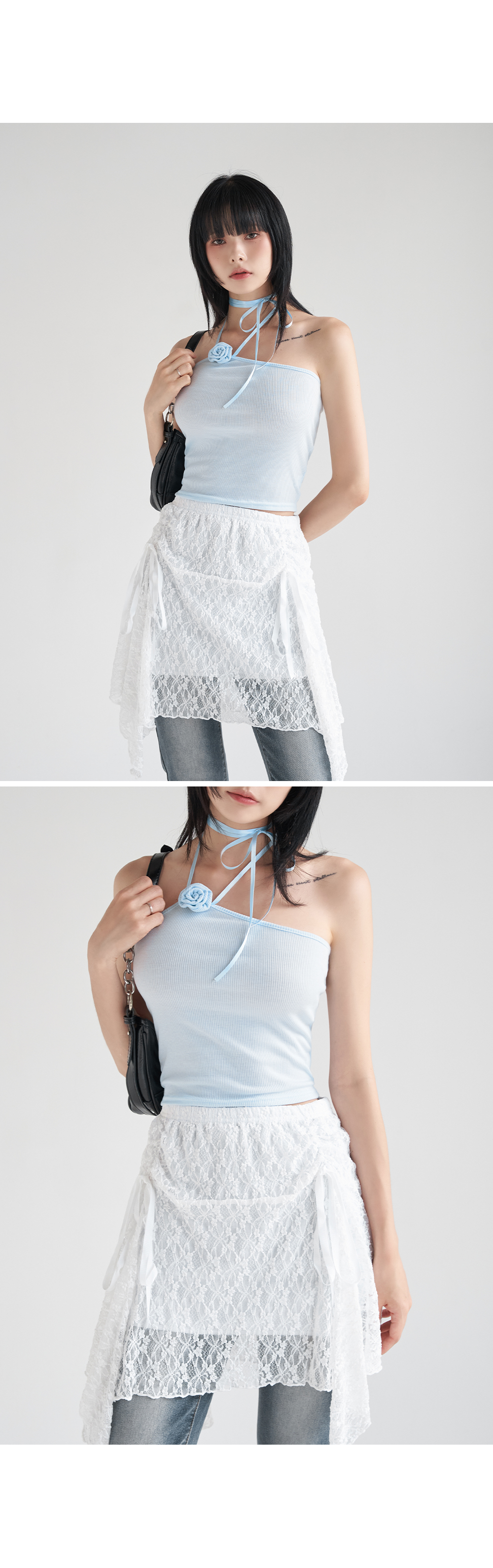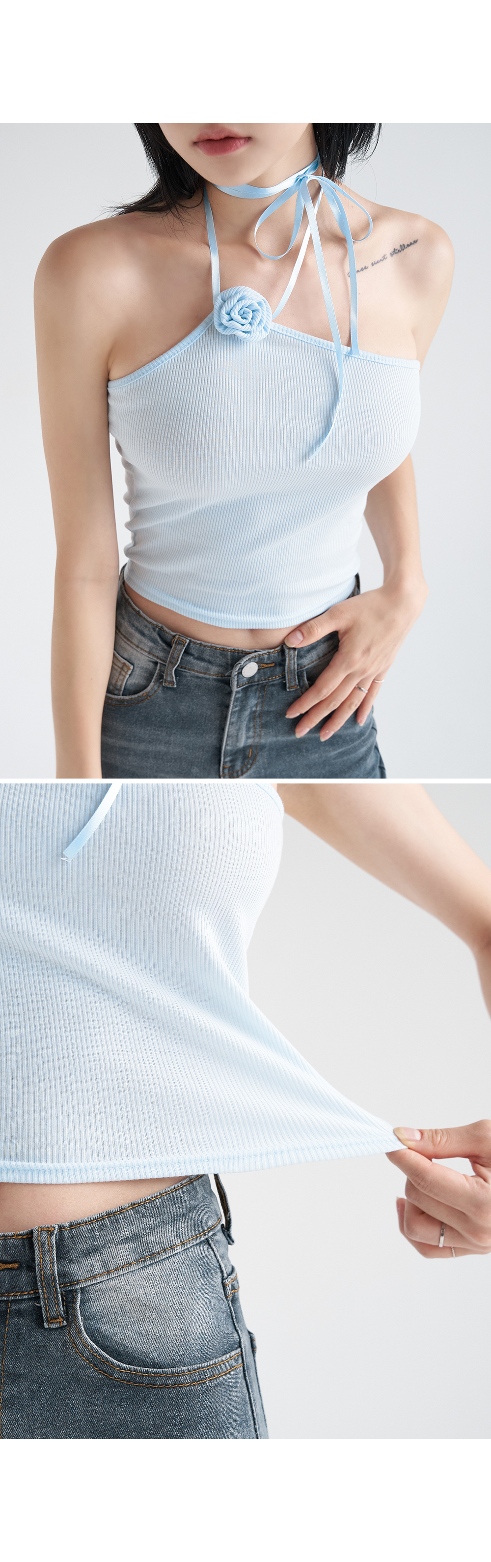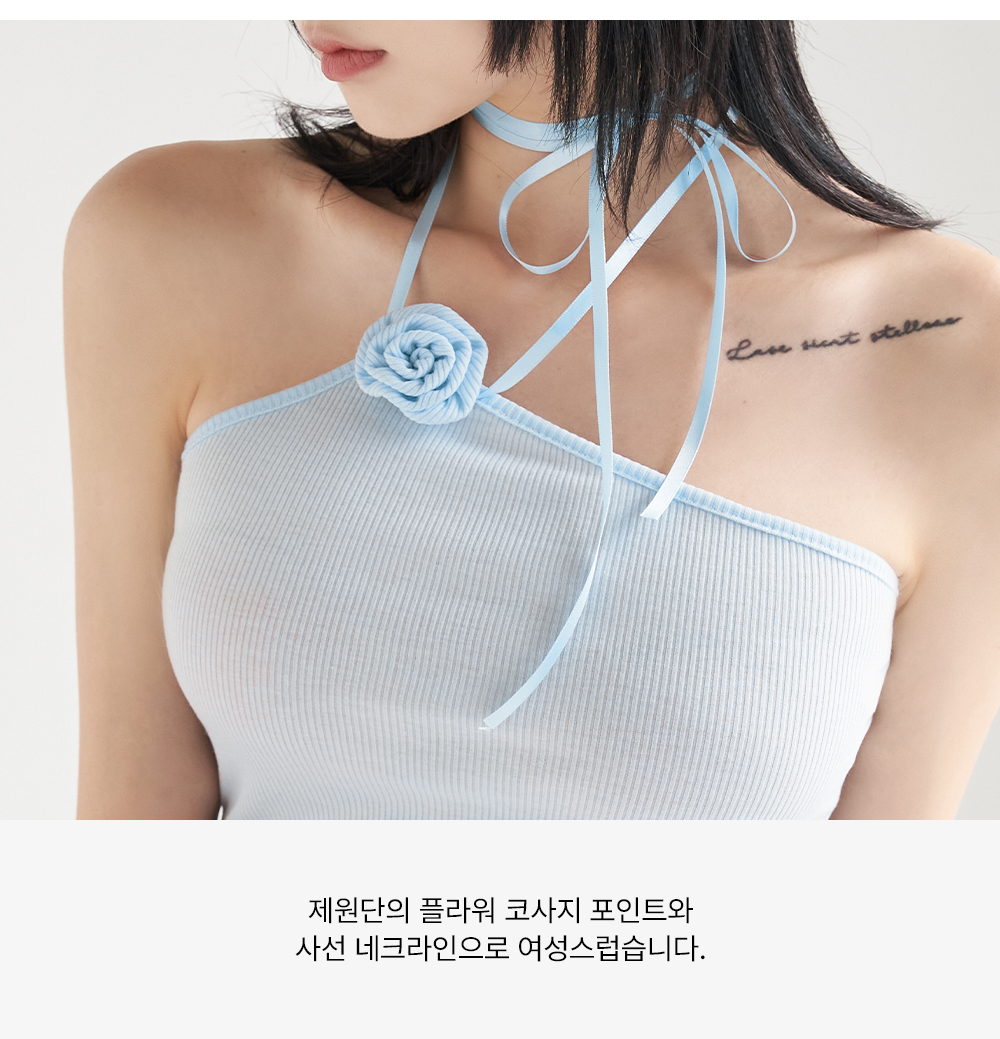 워터밤,휴가룩,바캉스룩,리본나시,크롭탑,페미닌룩,페미닌나시,코사지