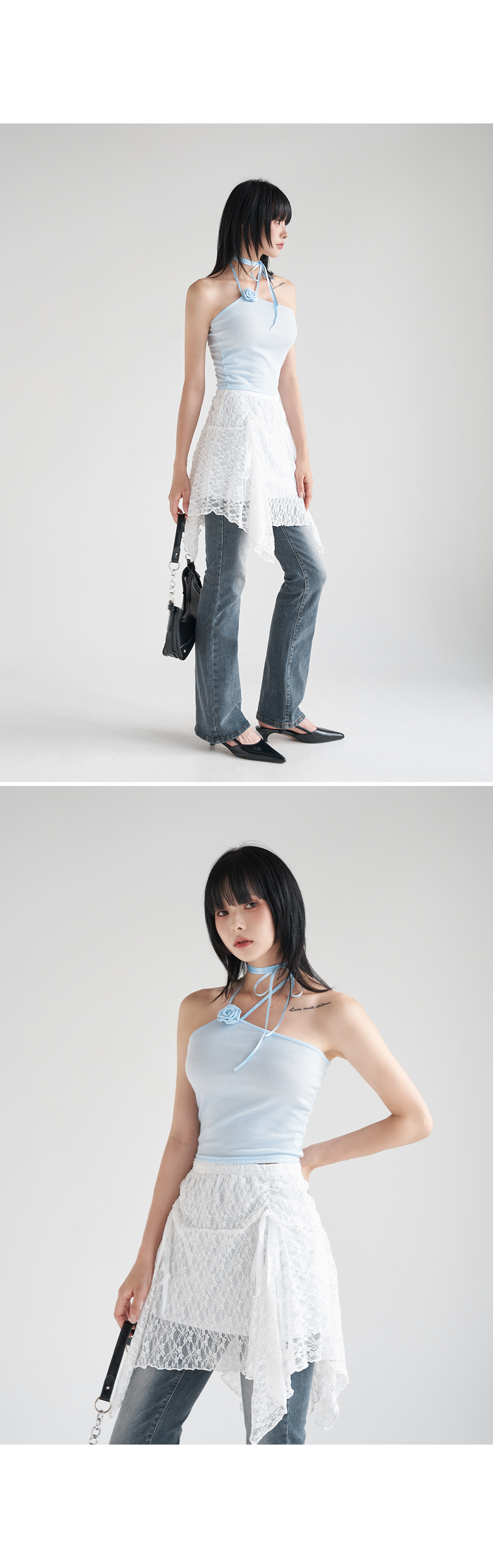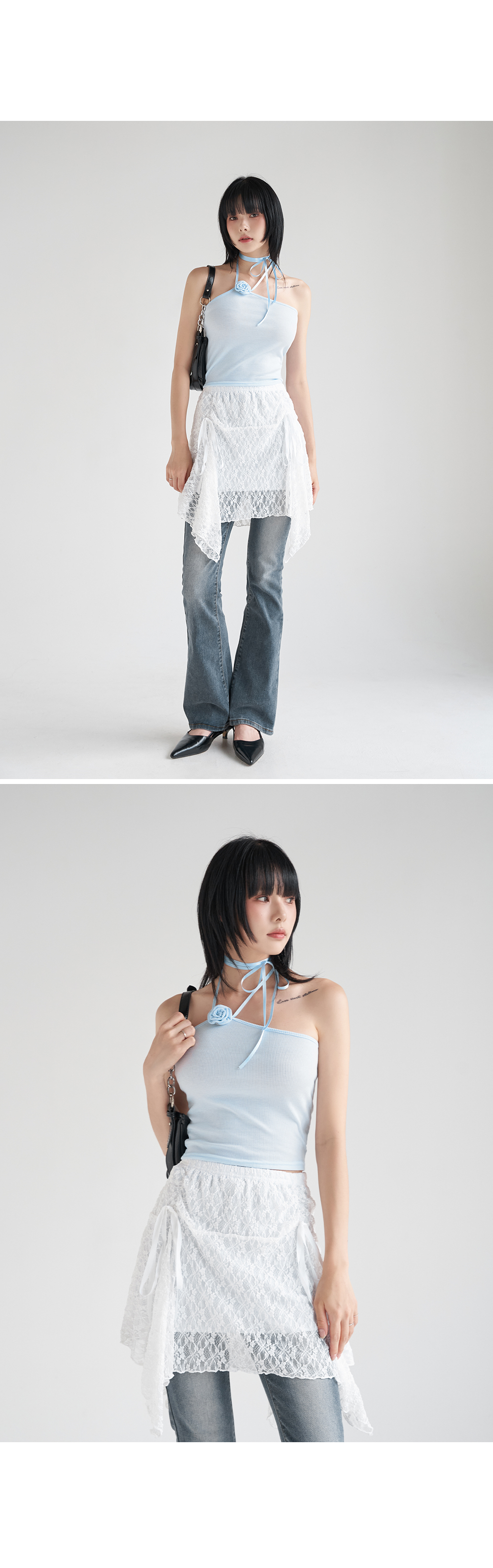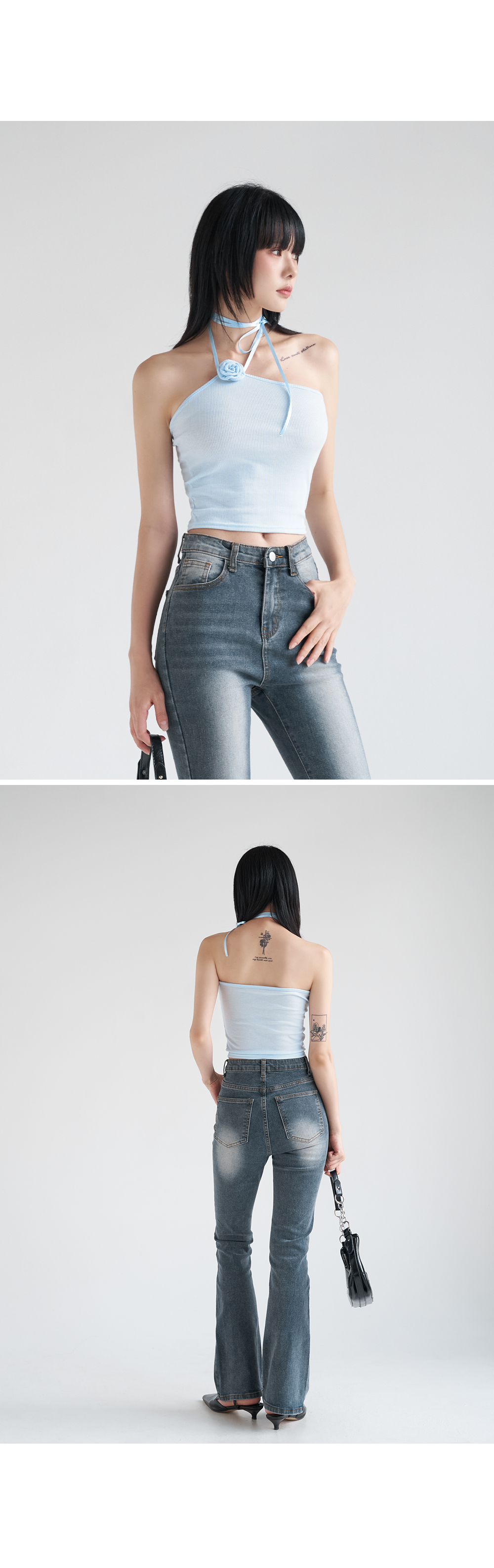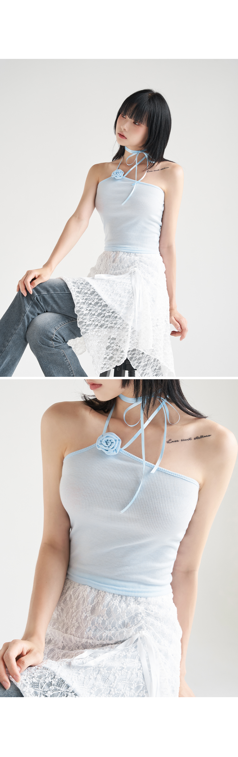 워터밤,휴가룩,바캉스룩,리본나시,크롭탑,페미닌룩,페미닌나시,코사지