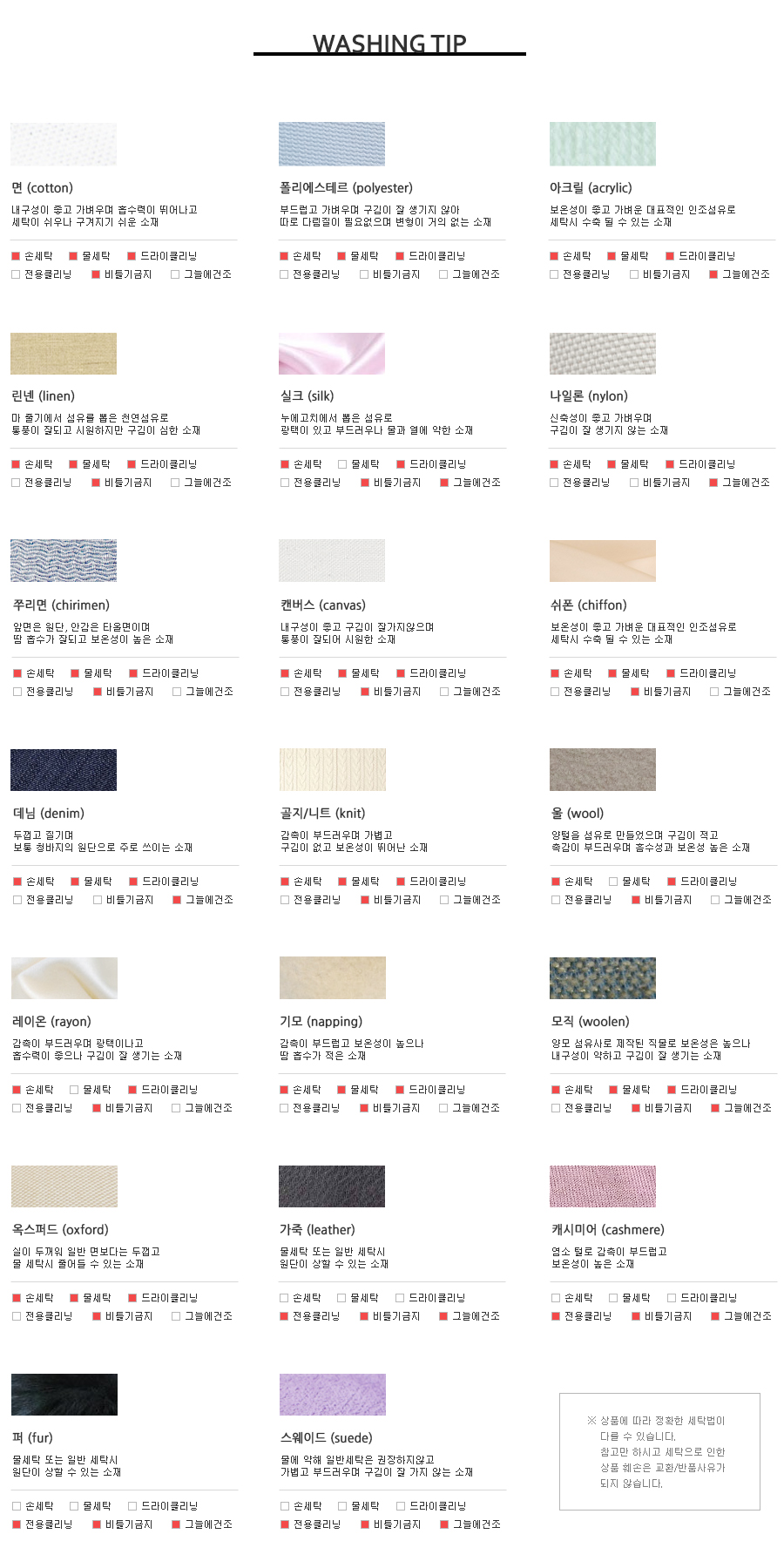 · 데님 및 컬러 제품은 이염 방지를 위해 단독 세탁을 권장합니다.