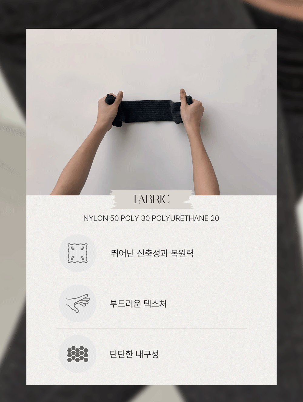 소재 : 나일론 50%, 폴리에스터 30%, 폴리우레탄 20%