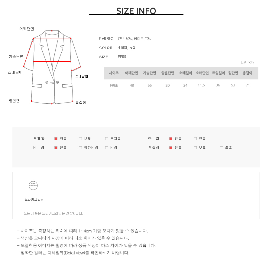 · 모든 의류의 첫 세탁은 드라이크리닝을 추천하며, 세탁 후 착용 부탁 드립니다.