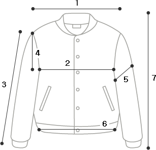 사이즈 | 1.어깨 | 2.가슴 | 3.팔기장 | 4.암홀 | 5.소매끝 | 6.밑단 | 7.총길이 |