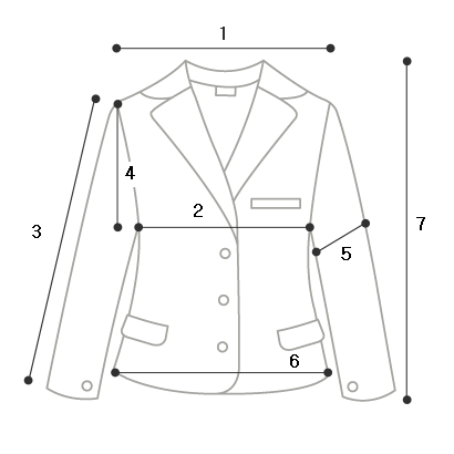 사이즈 | 1.어깨 | 2.가슴 | 3.소매 | 4.암홀 | 5.팔통 | 6.밑단 | 7.총길이 |