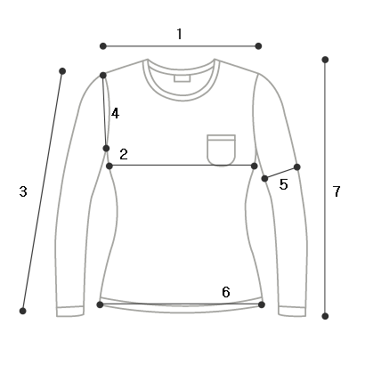 사이즈 | 1.어깨 | 2.가슴 | 3.소매 | 4.암홀 | 5.팔통 | 6.밑단 | 7.총길이 |