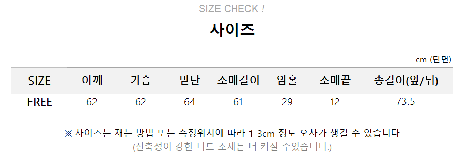 | 제품 측정 방법에 따라 1~3cm 오차가 발생할 수 있으며, 사이즈는 단면으로 측정됩니다 | ||||||