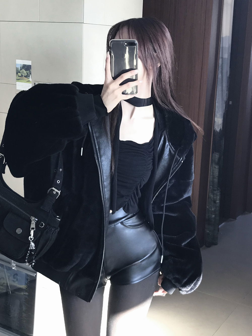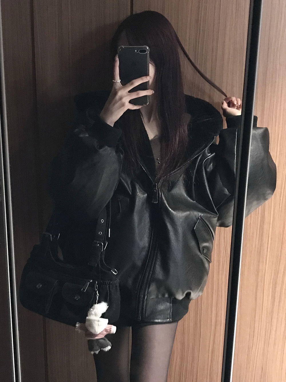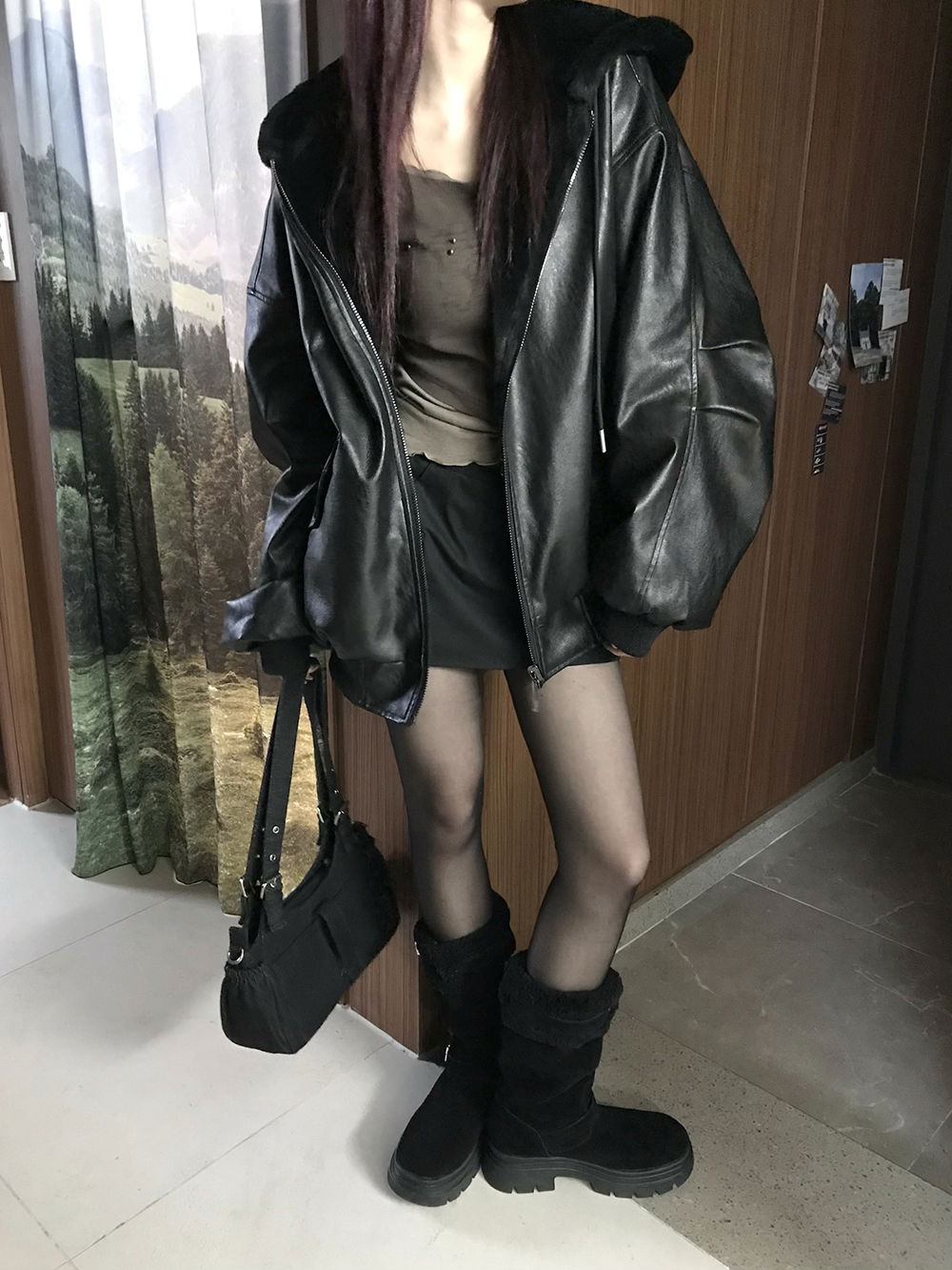 레더와 퍼에 넉넉한 후드가 합쳐져