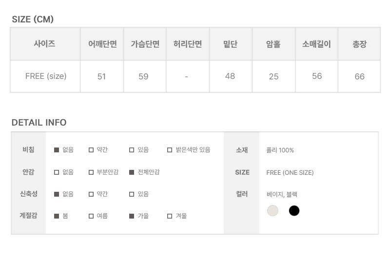 | 사이즈 | 어깨너비 | 가슴 | 암홀 | 팔길이 | 총길이 |