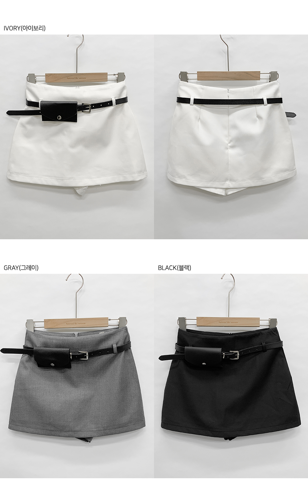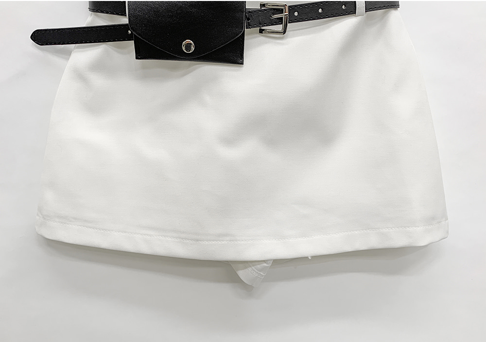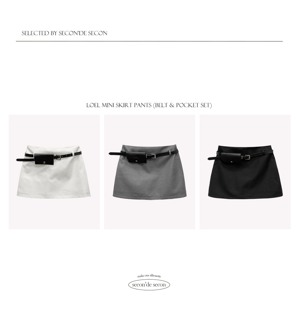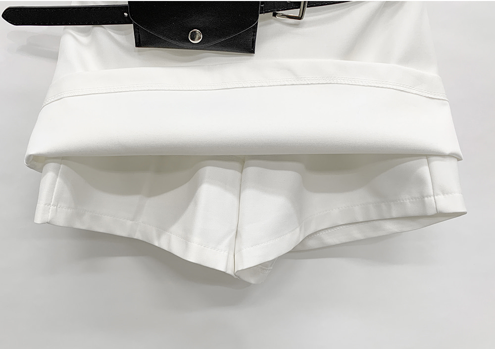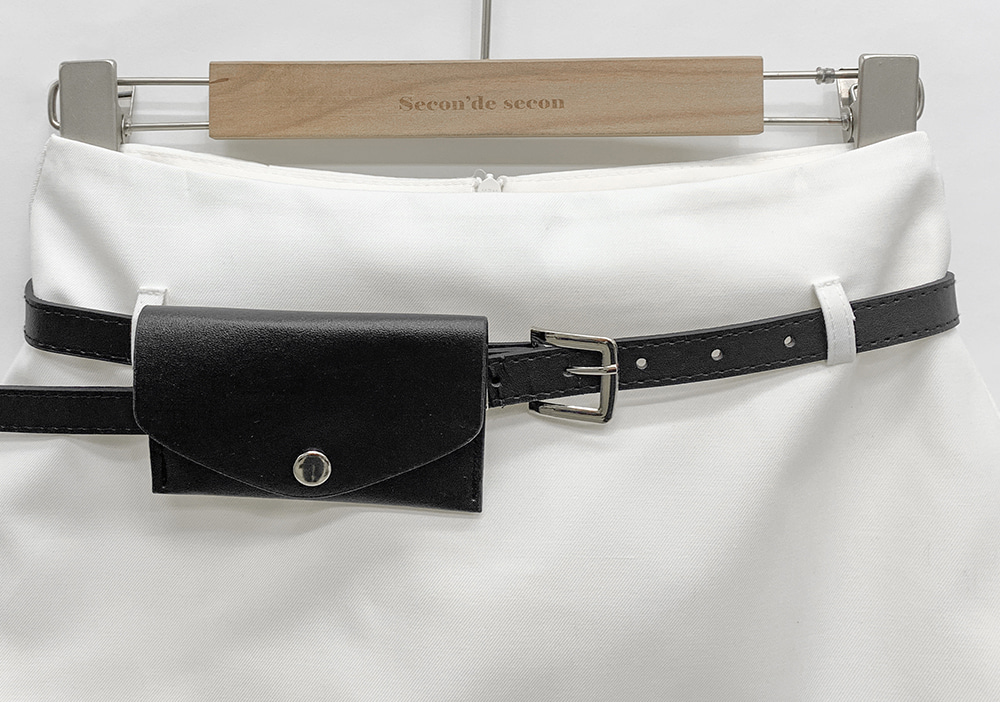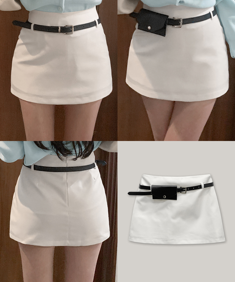 기본적인 미니 스커트 팬츠에 블랙 벨트와 미니 포켓 파우치가 세트로 구성되어 있어요.