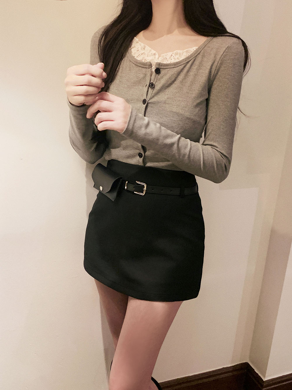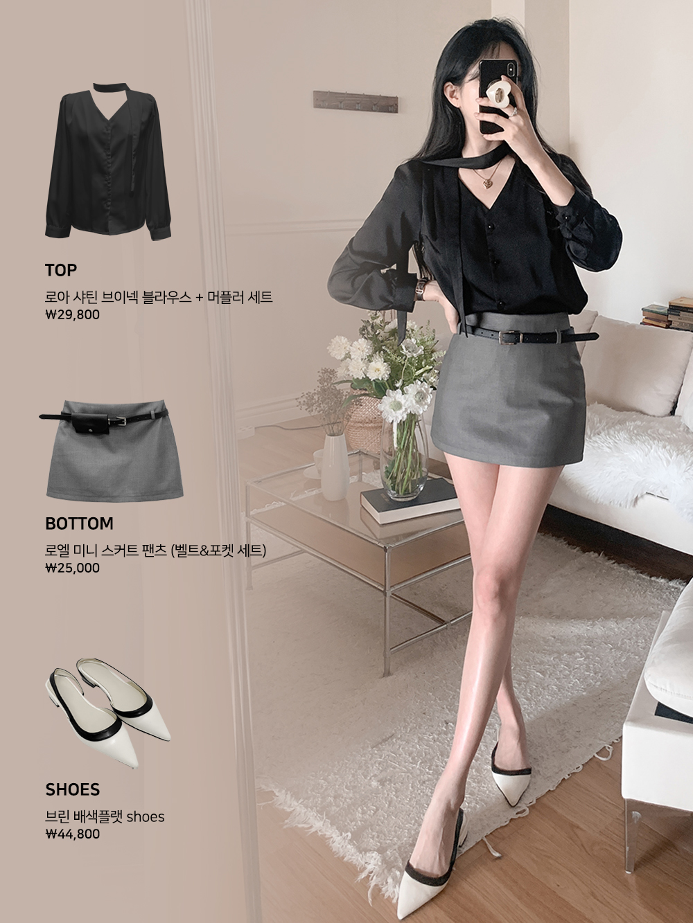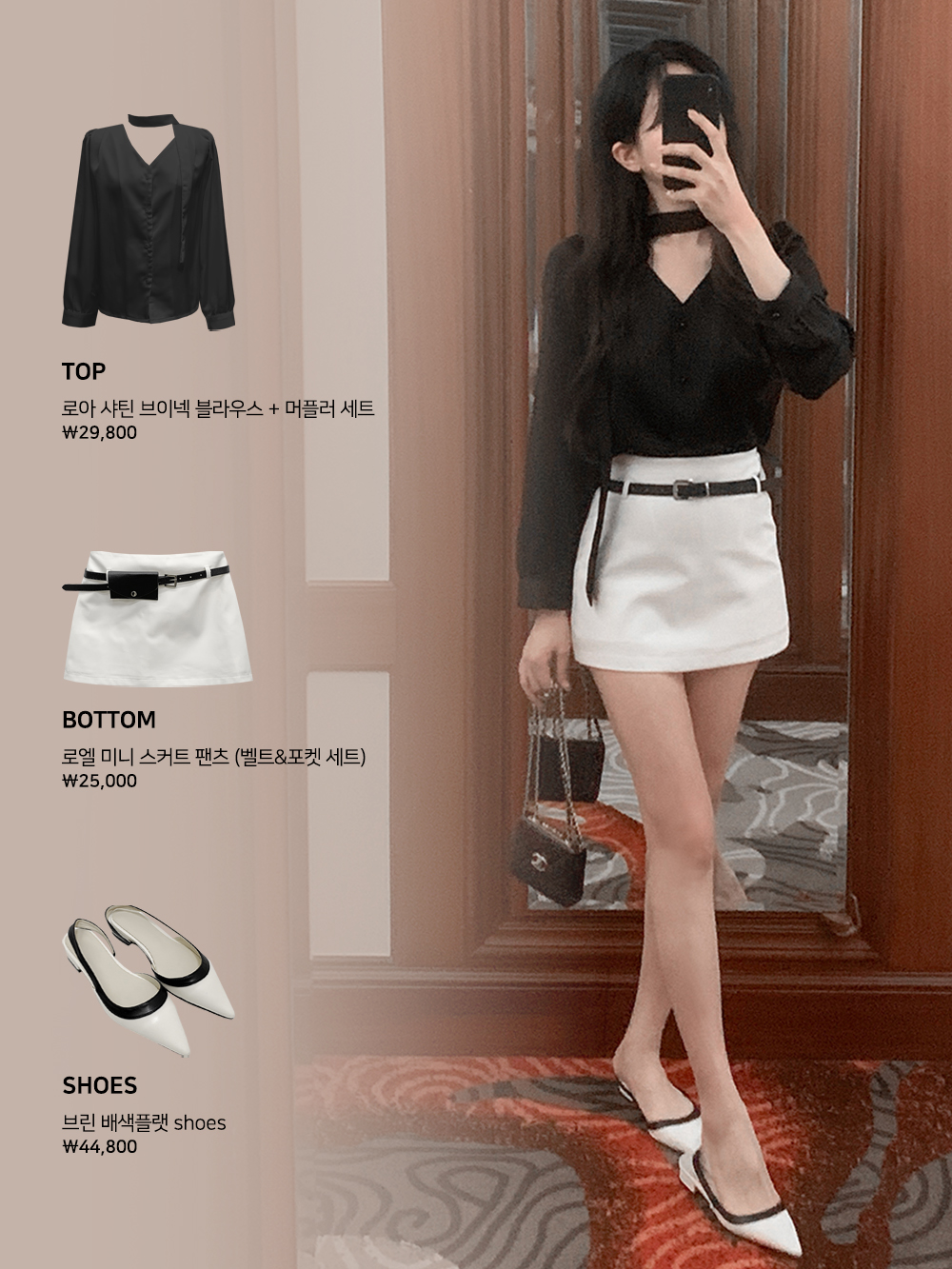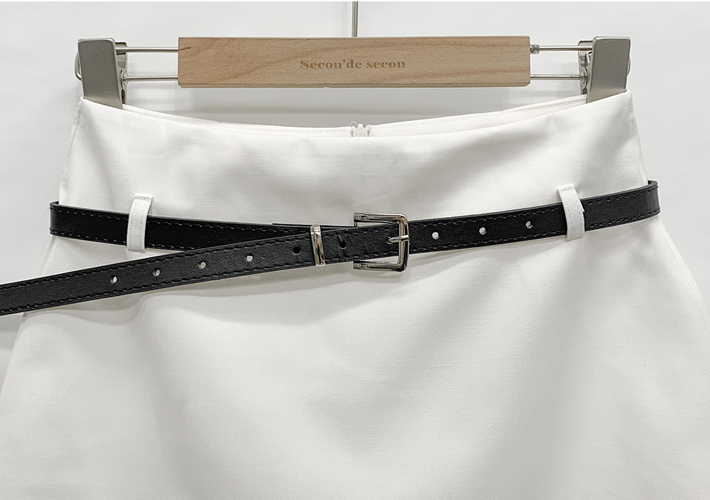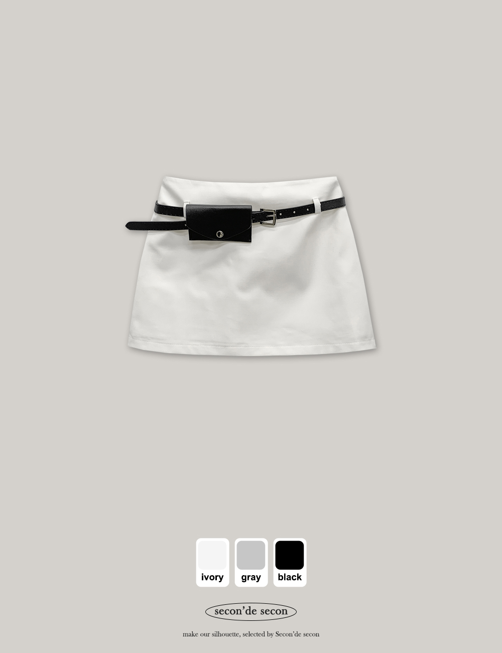 기본적인 미니 스커트 팬츠에 블랙 벨트와 미니 포켓 파우치가 세트로 구성되어 있어요.