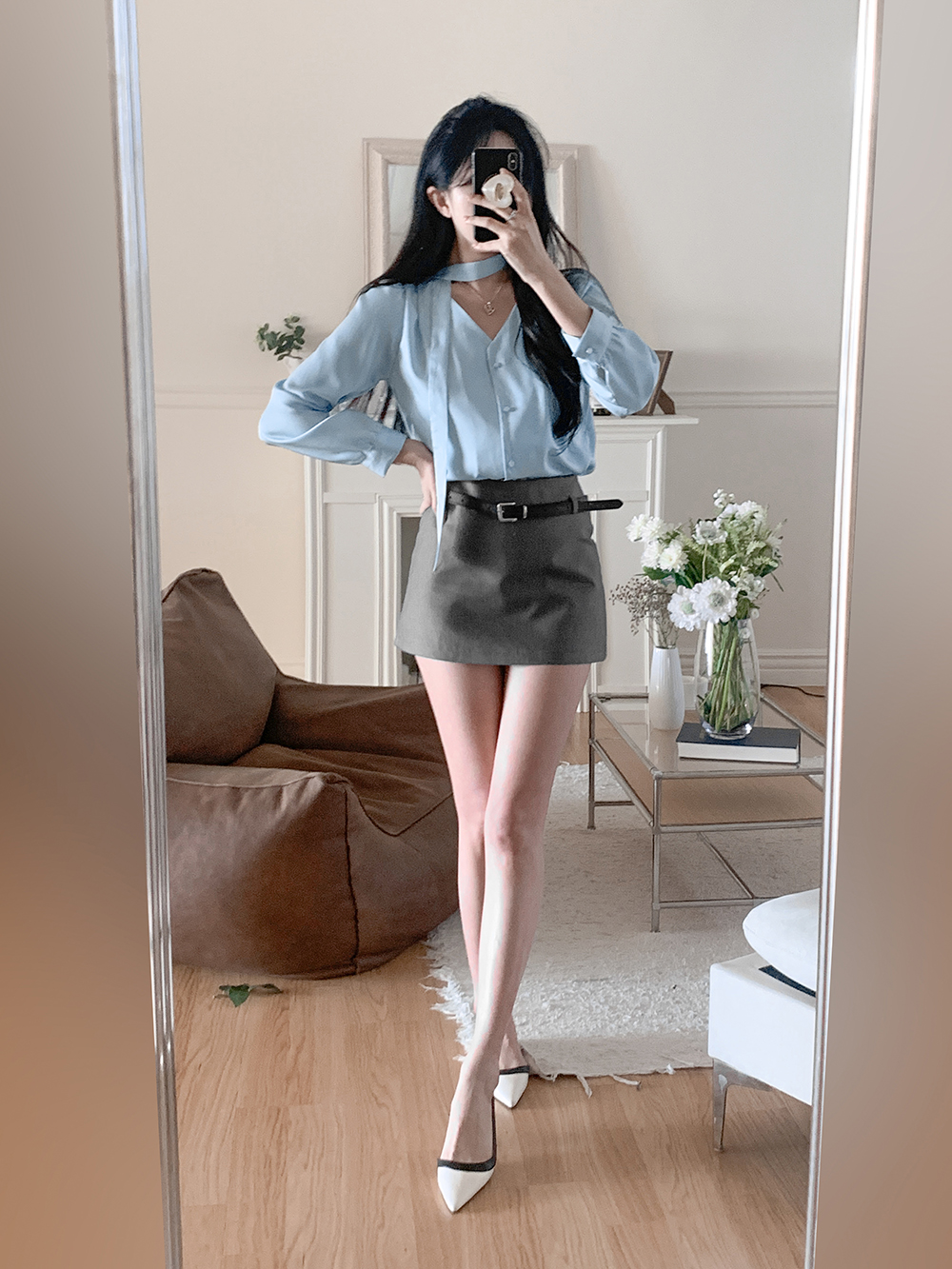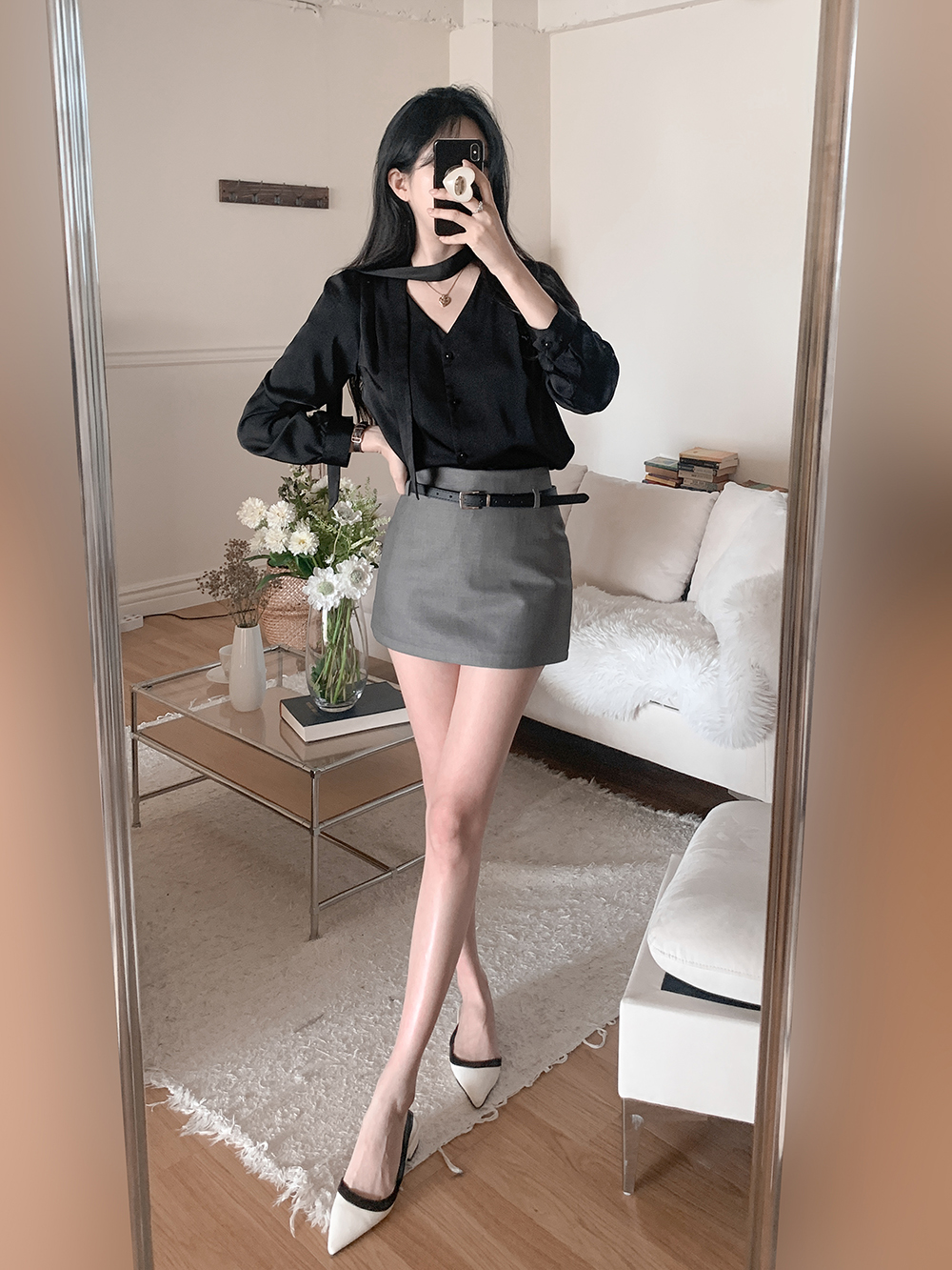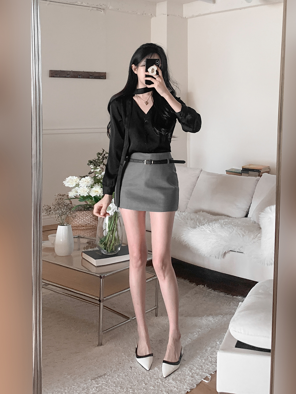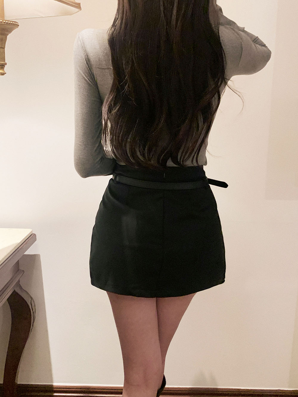 기본적인 미니 스커트 팬츠에 블랙 벨트와 미니 포켓 파우치가 세트로 구성되어 있어요.