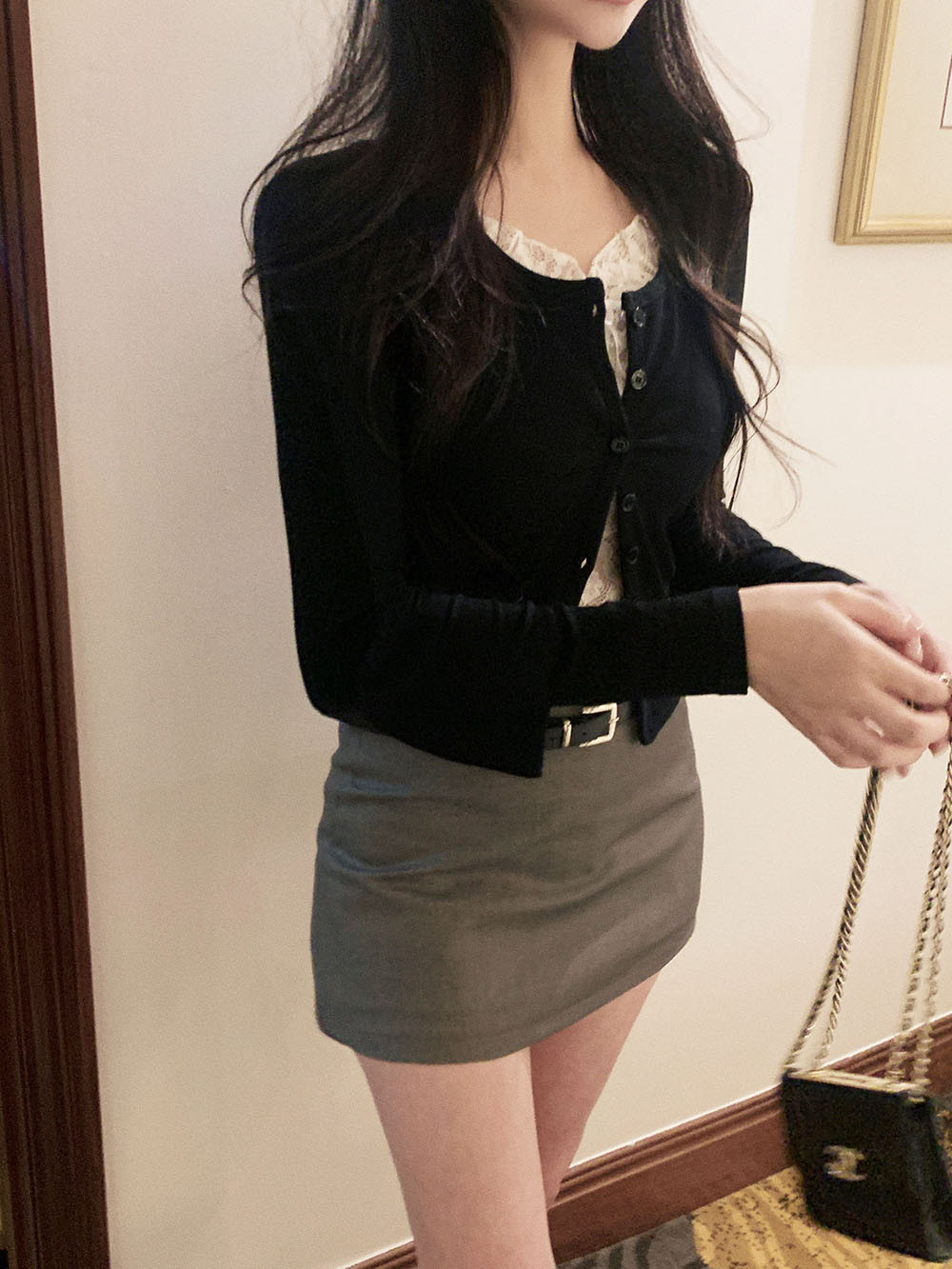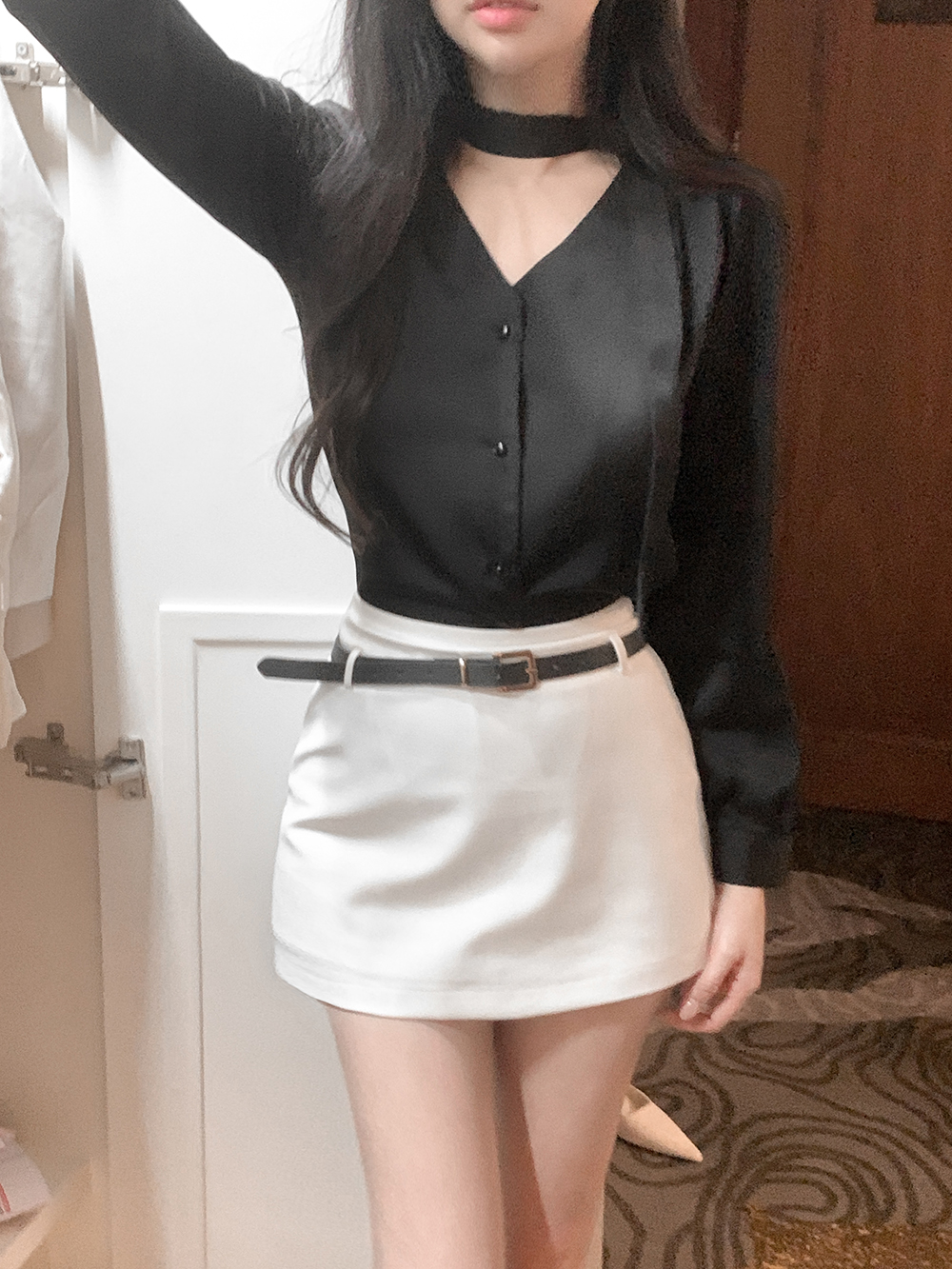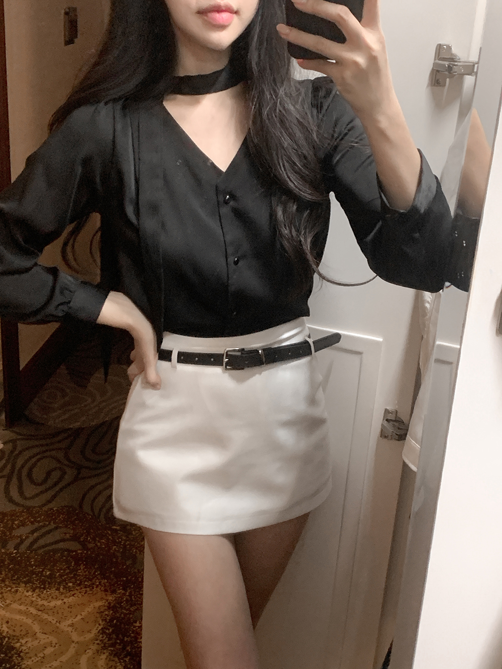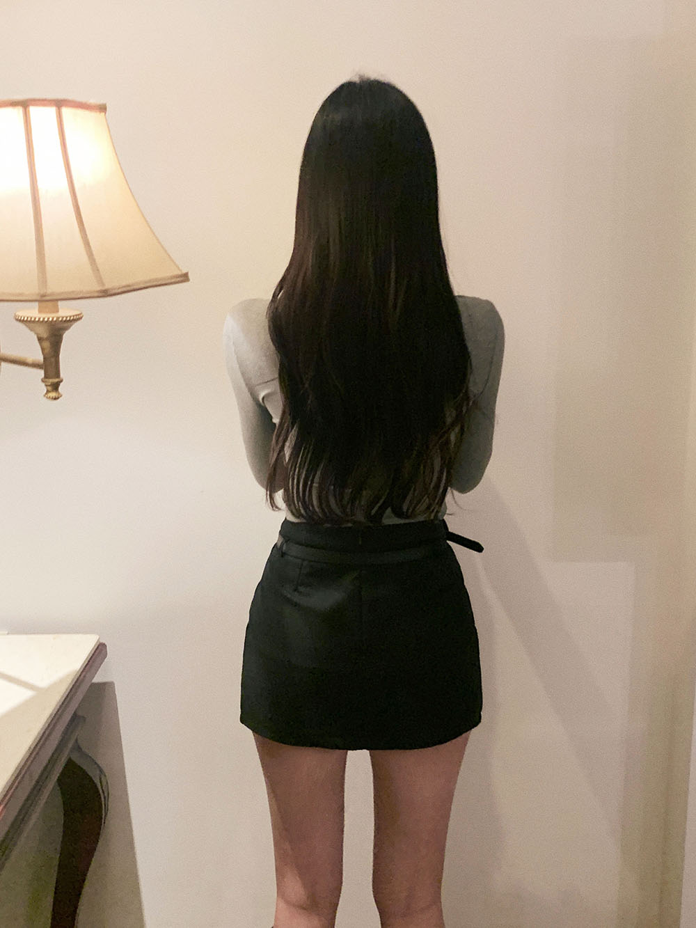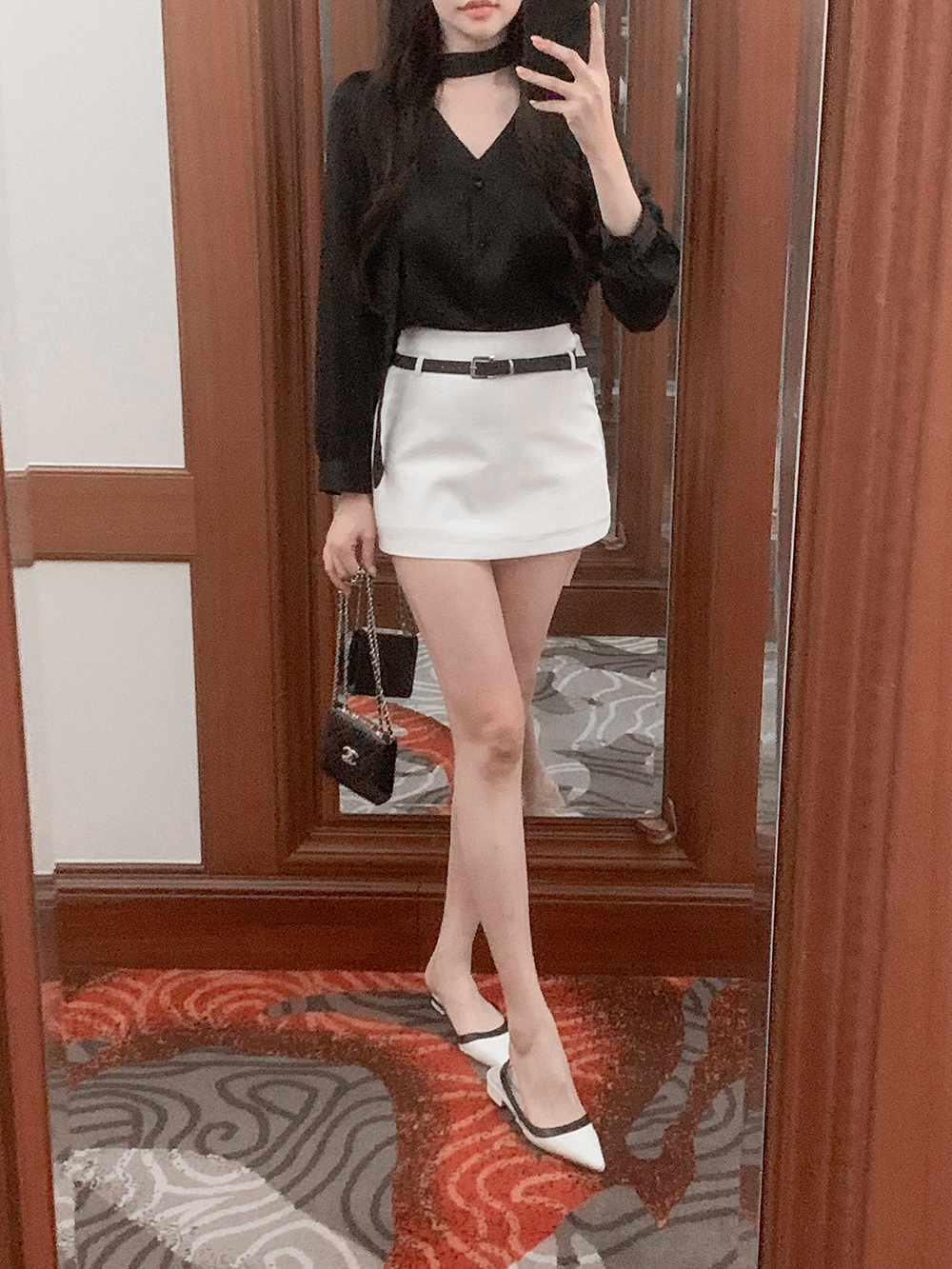 기본적인 미니 스커트 팬츠에 블랙 벨트와 미니 포켓 파우치가 세트로 구성되어 있어요.