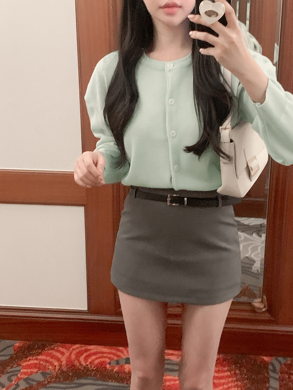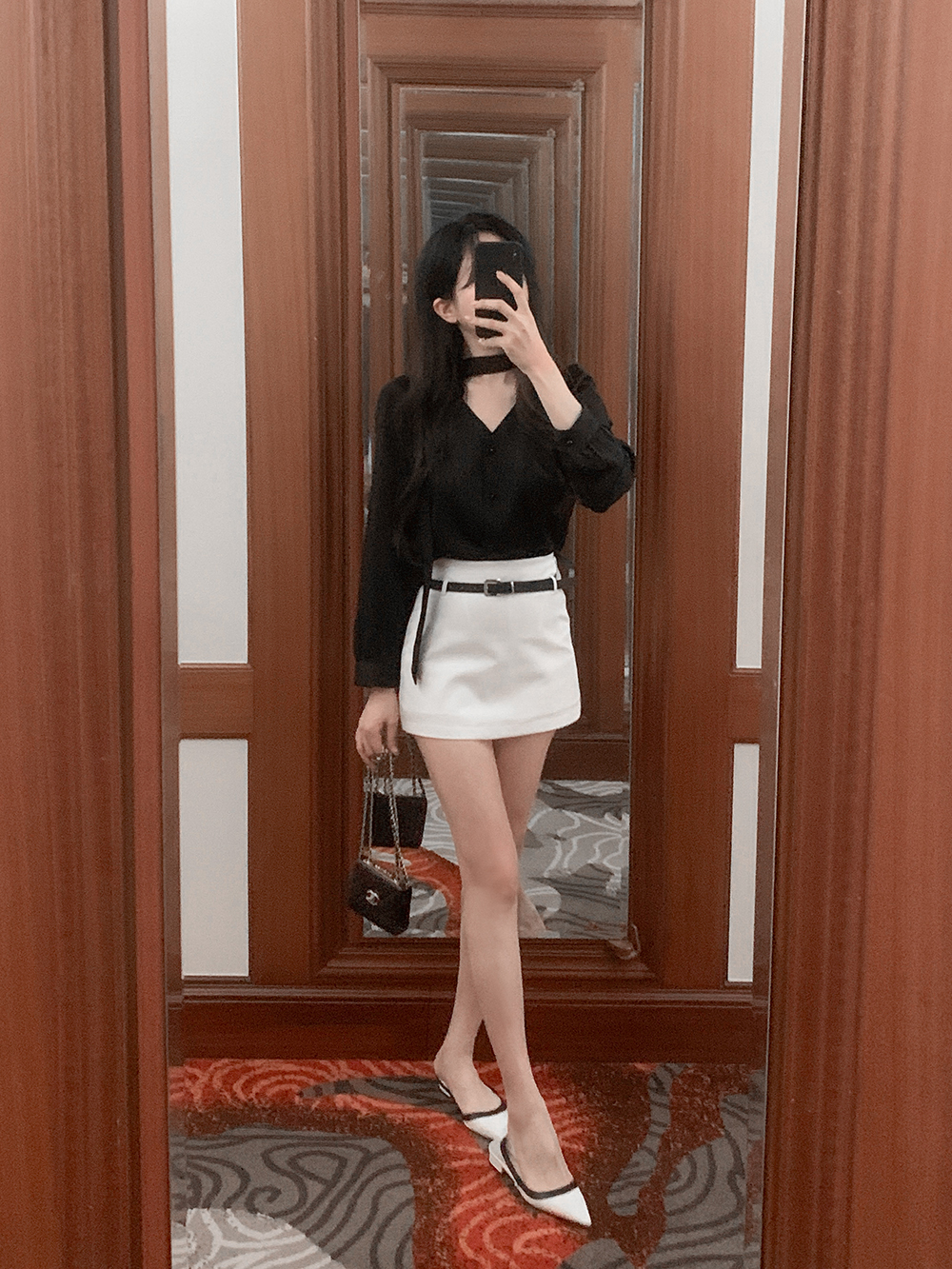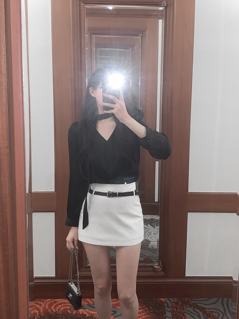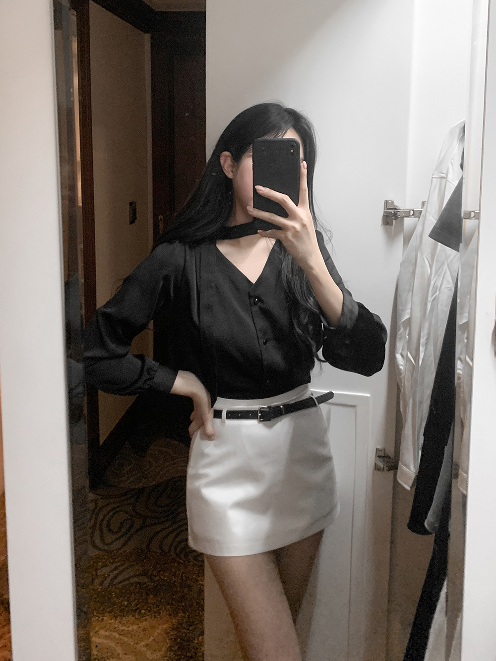기본적인 미니 스커트 팬츠에 블랙 벨트와 미니 포켓 파우치가 세트로 구성되어 있어요.