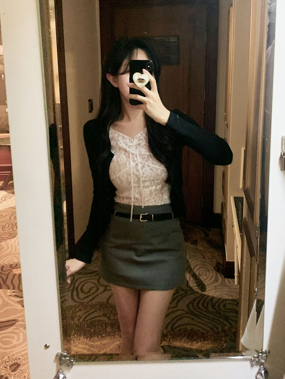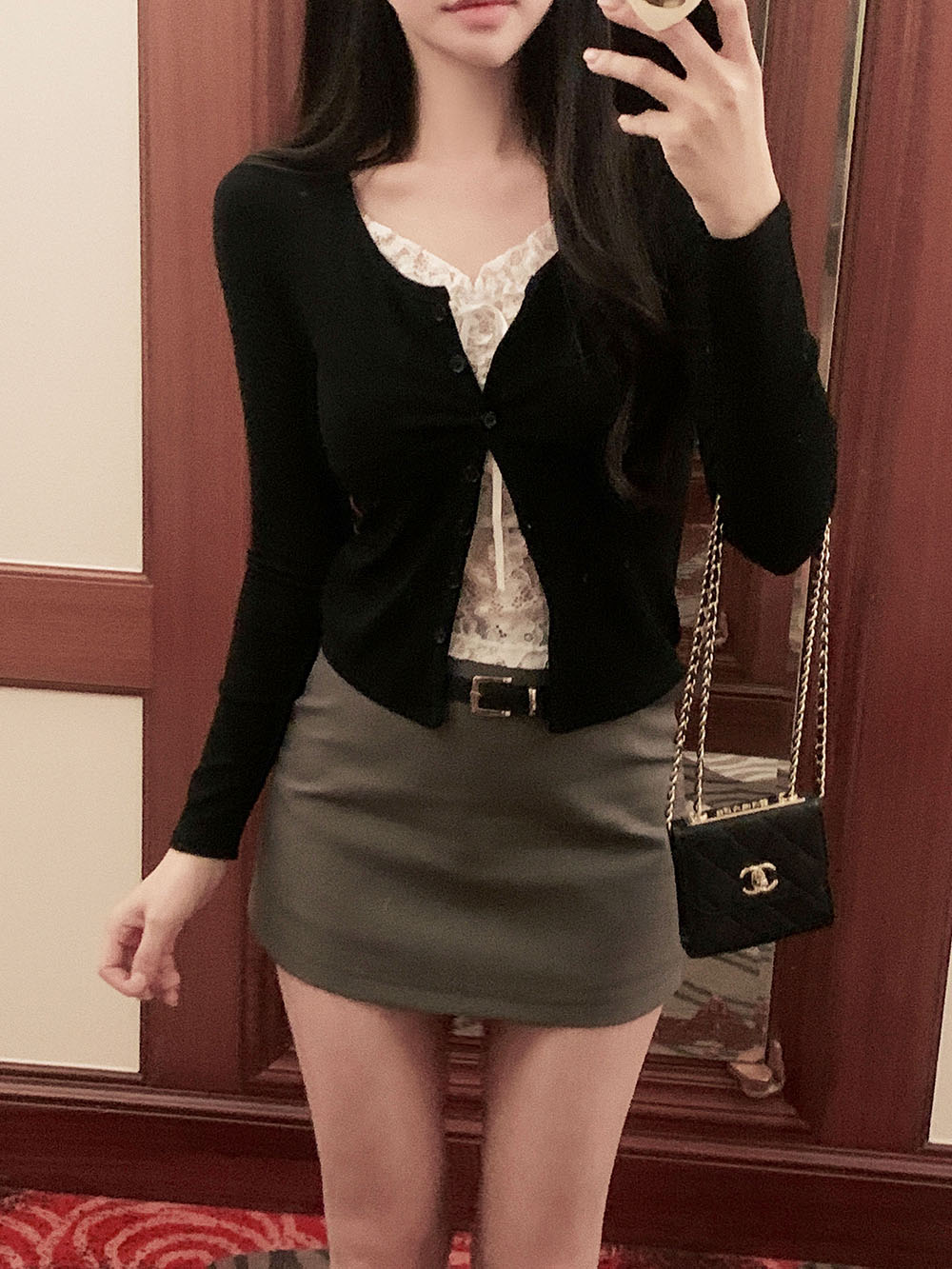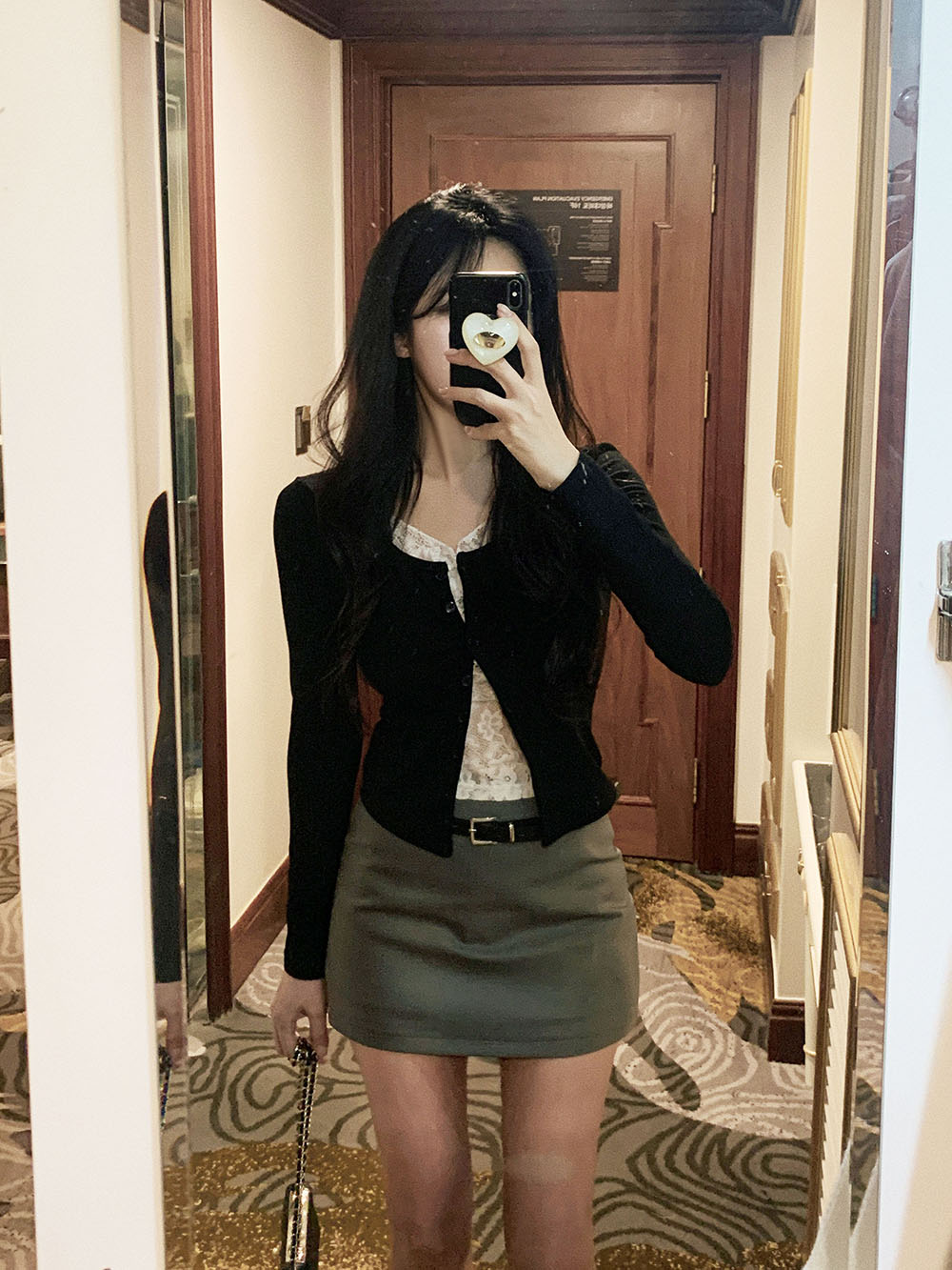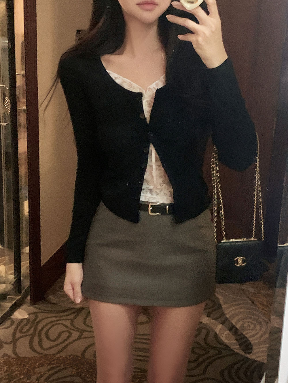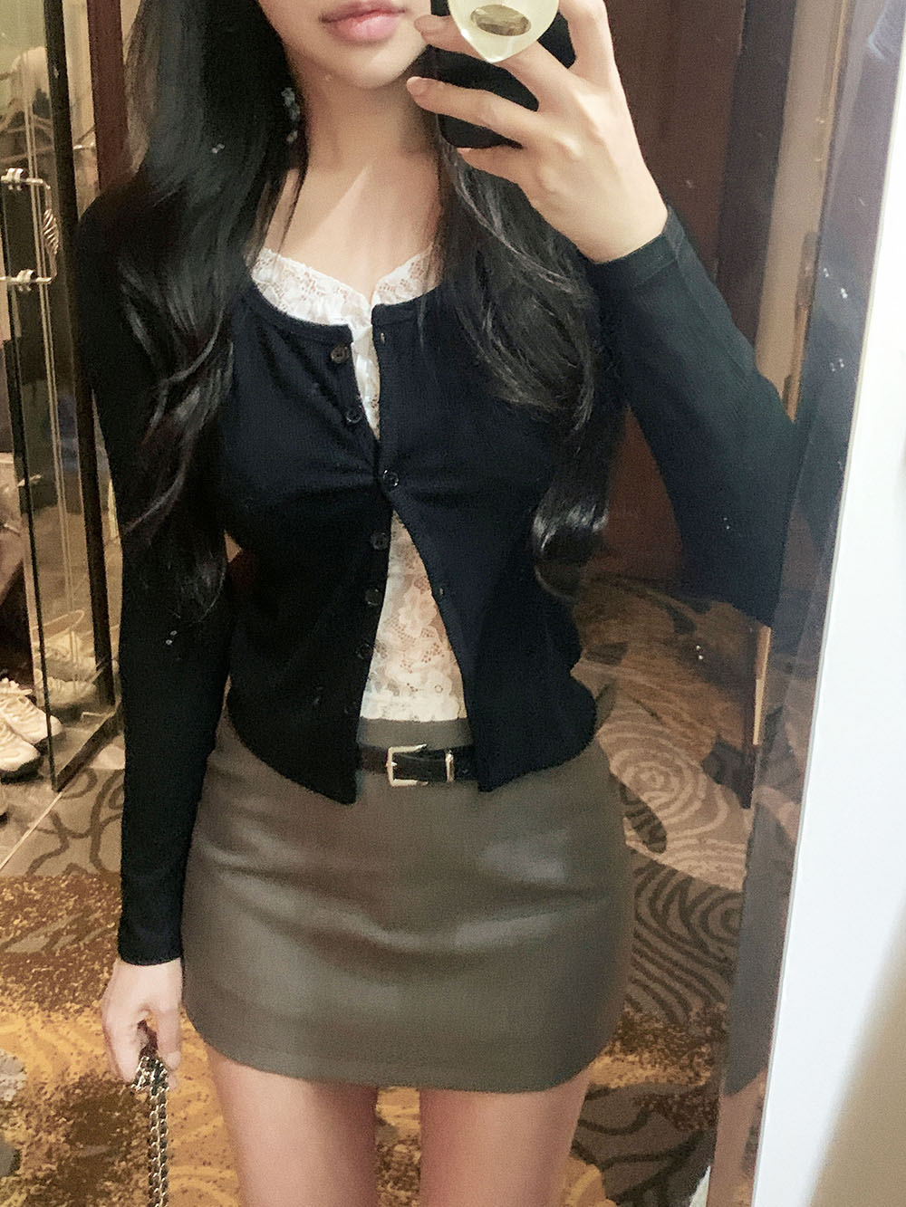 기본적인 미니 스커트 팬츠에 블랙 벨트와 미니 포켓 파우치가 세트로 구성되어 있어요.