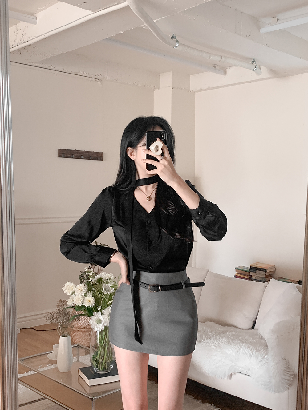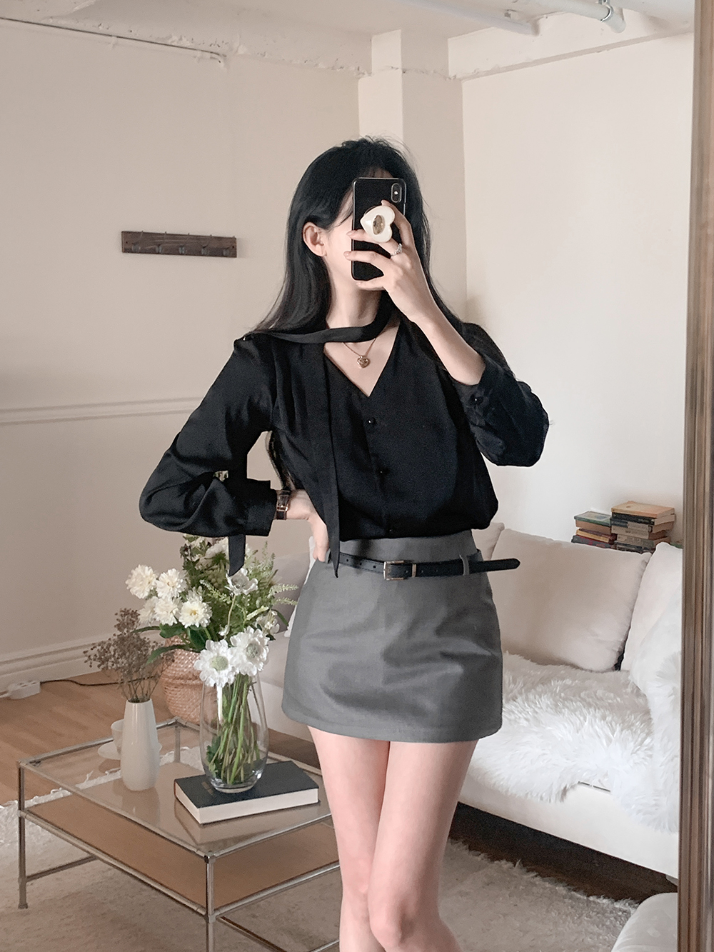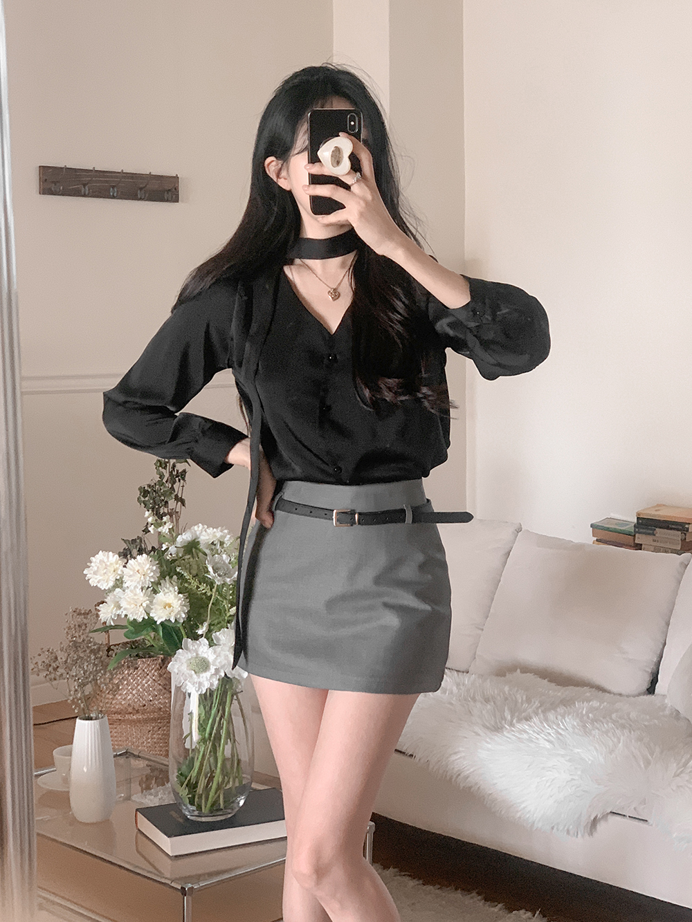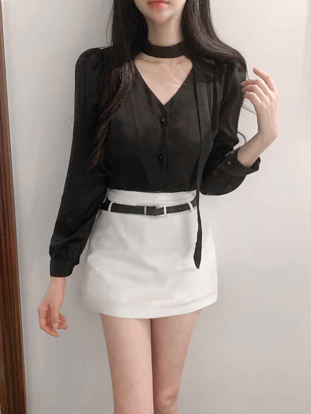 로아 샤틴 브이넥 블라우스 + 머플러 세트 (블랙)