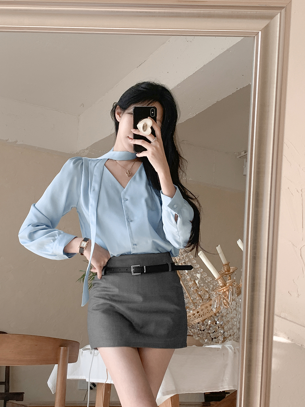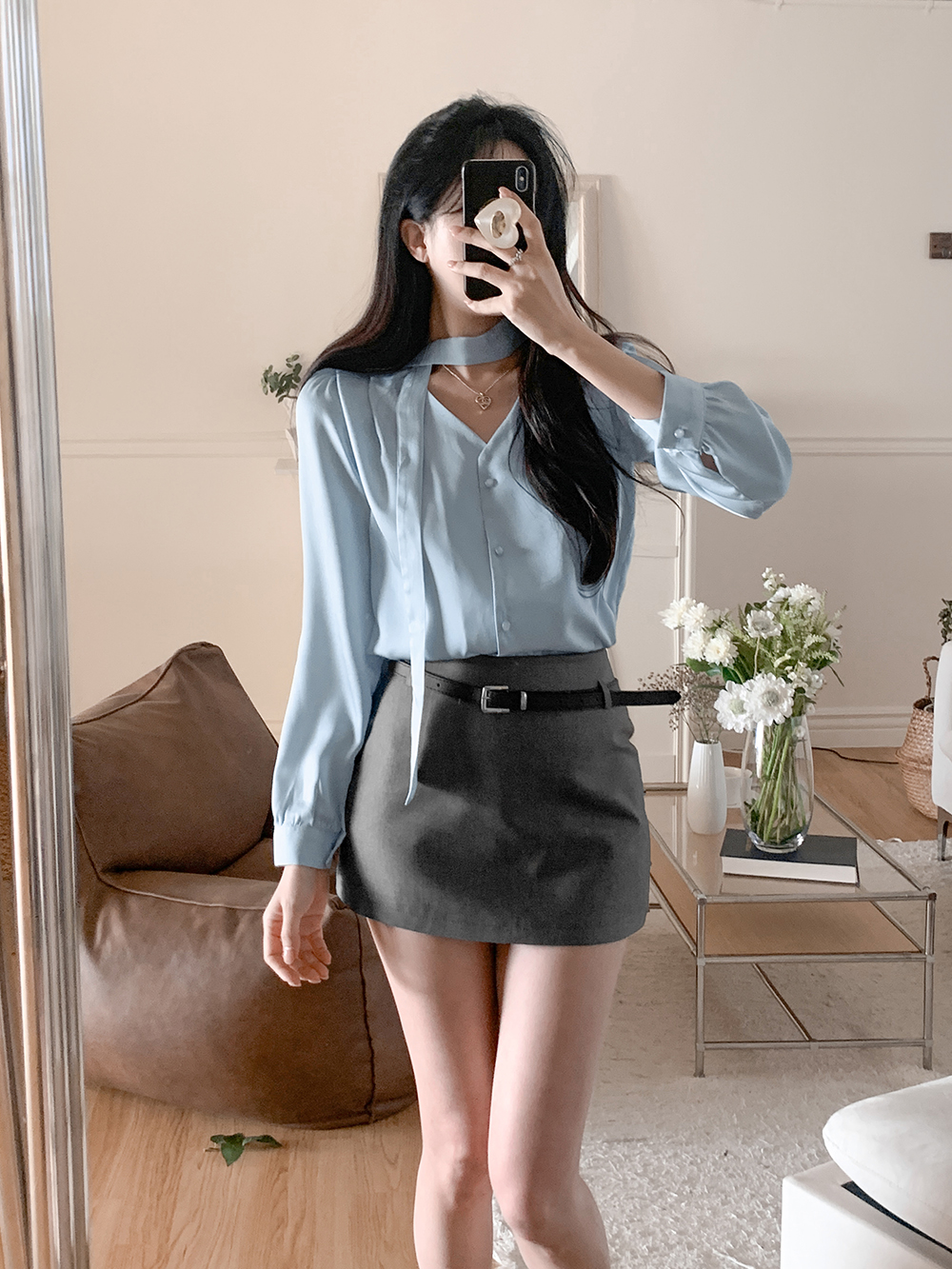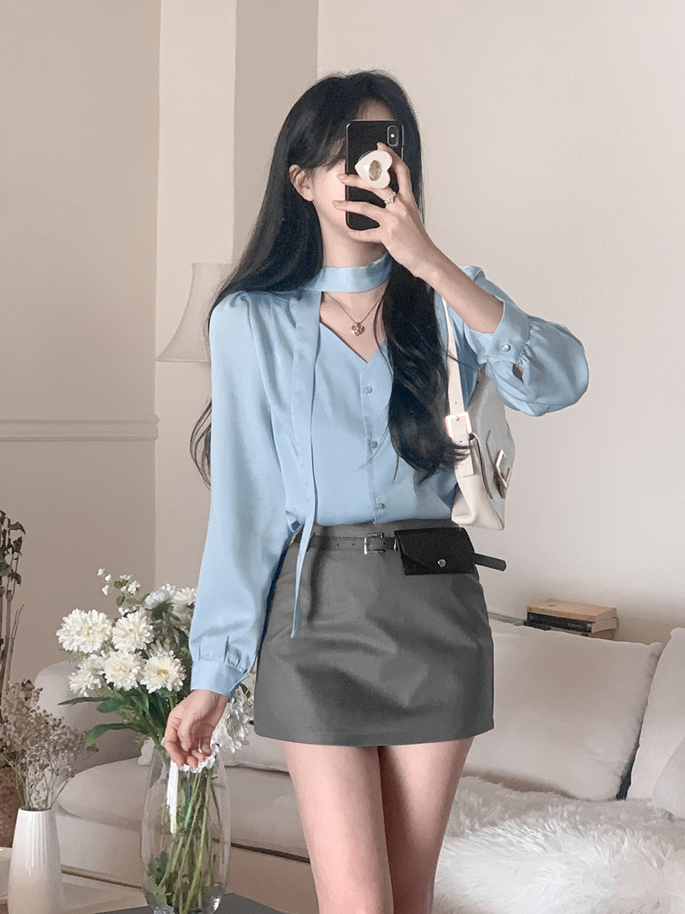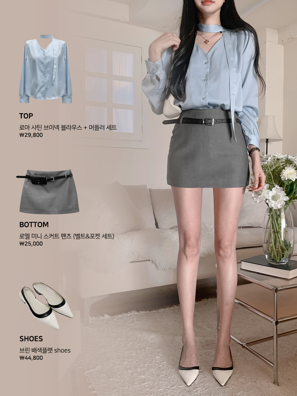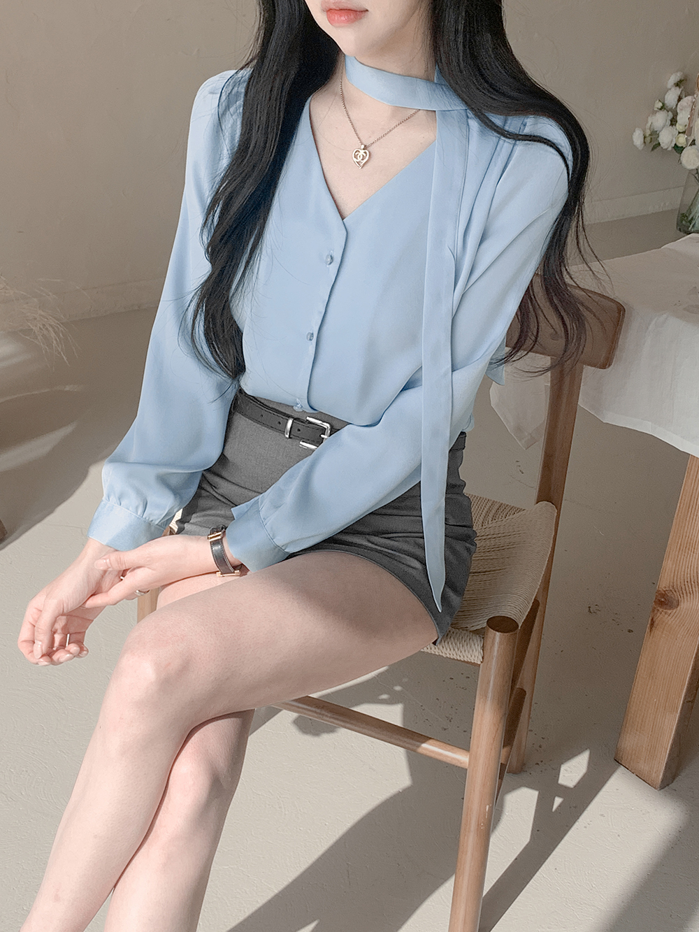 로아 샤틴 브이넥 블라우스 + 머플러 세트 (소라)