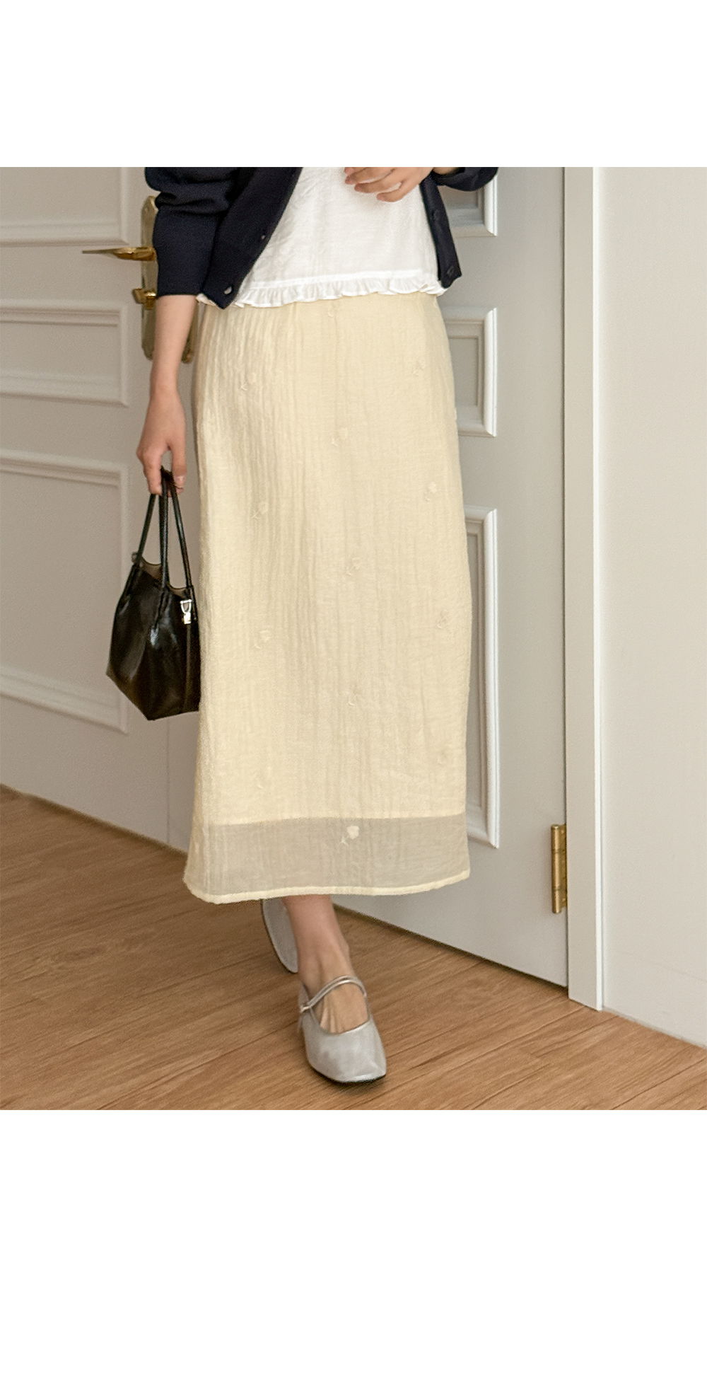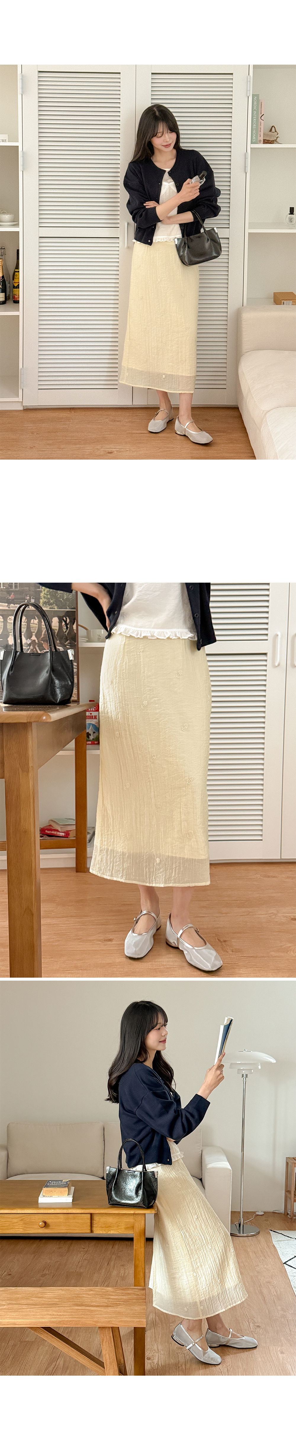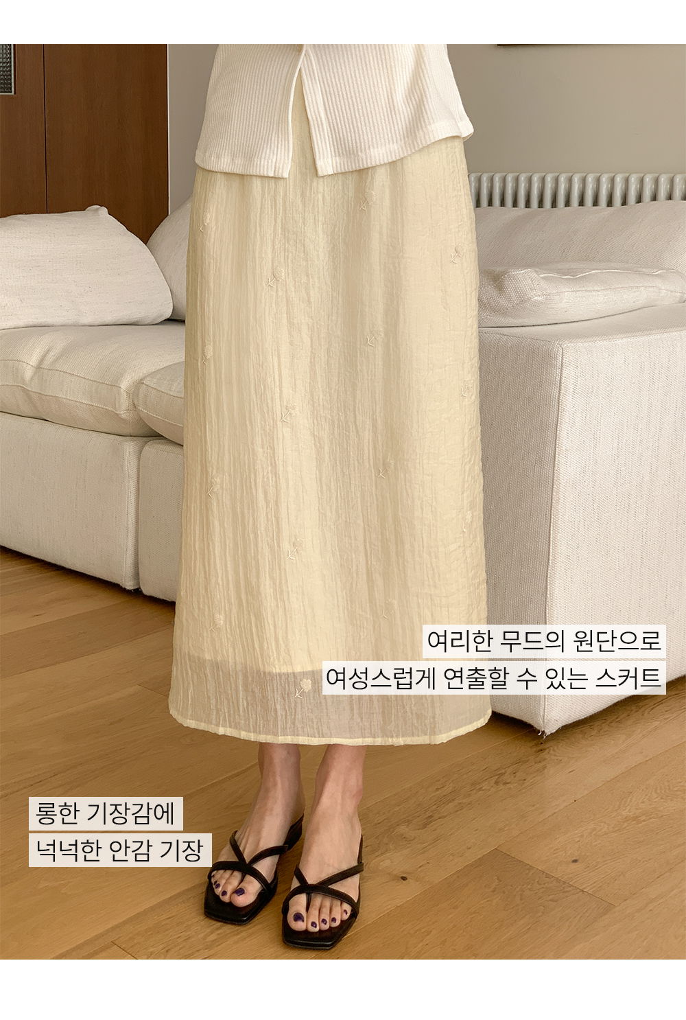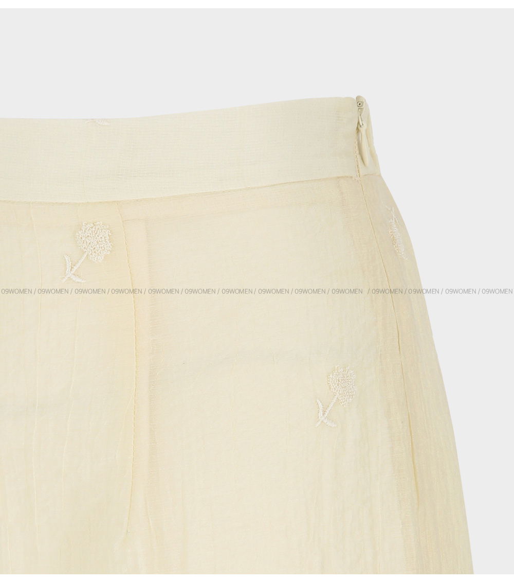 페미닌한 무드의 뒷밴딩 자수 롱 스커트