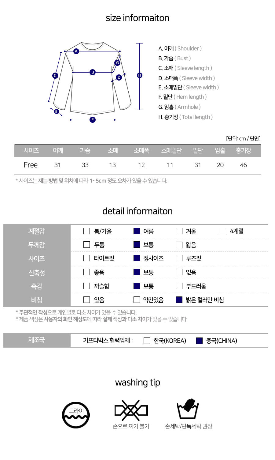 | 사이즈 | 어깨너비 | 가슴 | 암홀 | 팔길이 | 팔폭 | 총길이 |