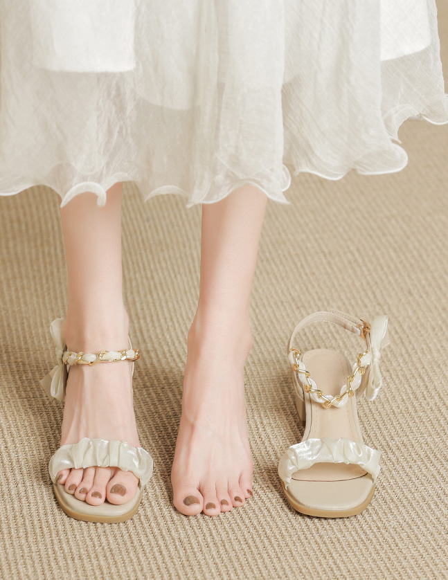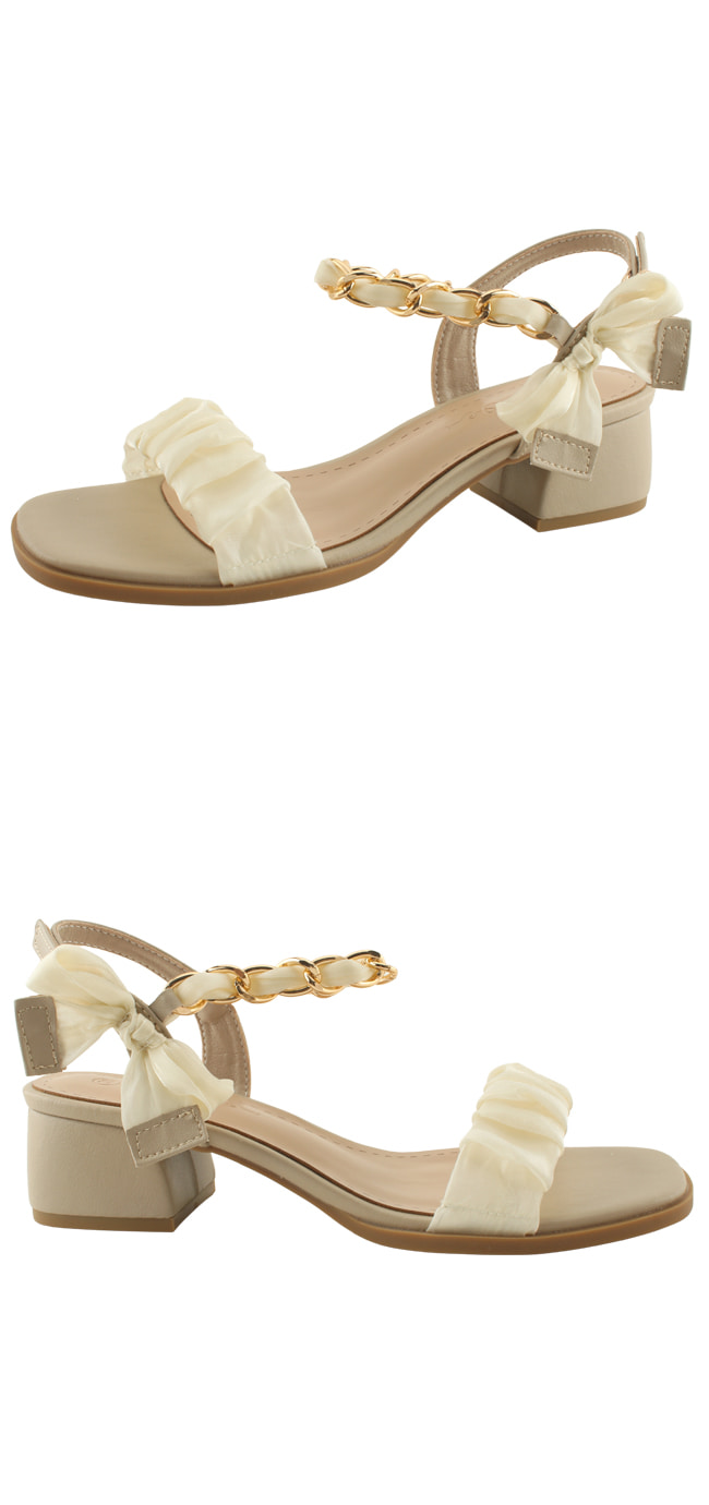- 페미닌한 주름 곱창 스트랩 통굽 미들힐 샌들입니다.