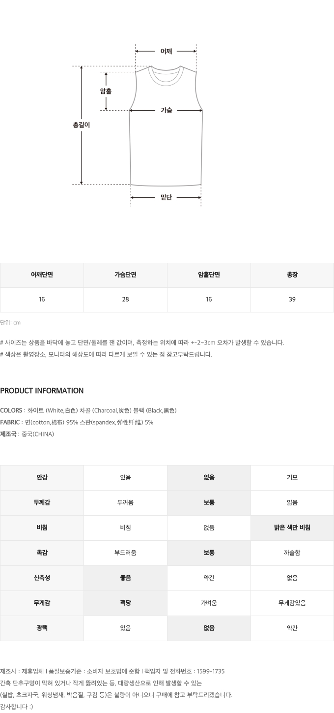 • FABRIC : 면(cotton,棉布) 95% 스판(spandex,弹性纤维) 5%