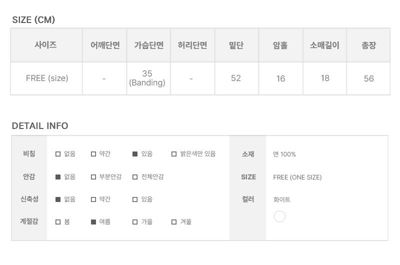 | 사이즈 | 가슴 | 암홀 | 팔길이 | 밑단 | 총길이 |
