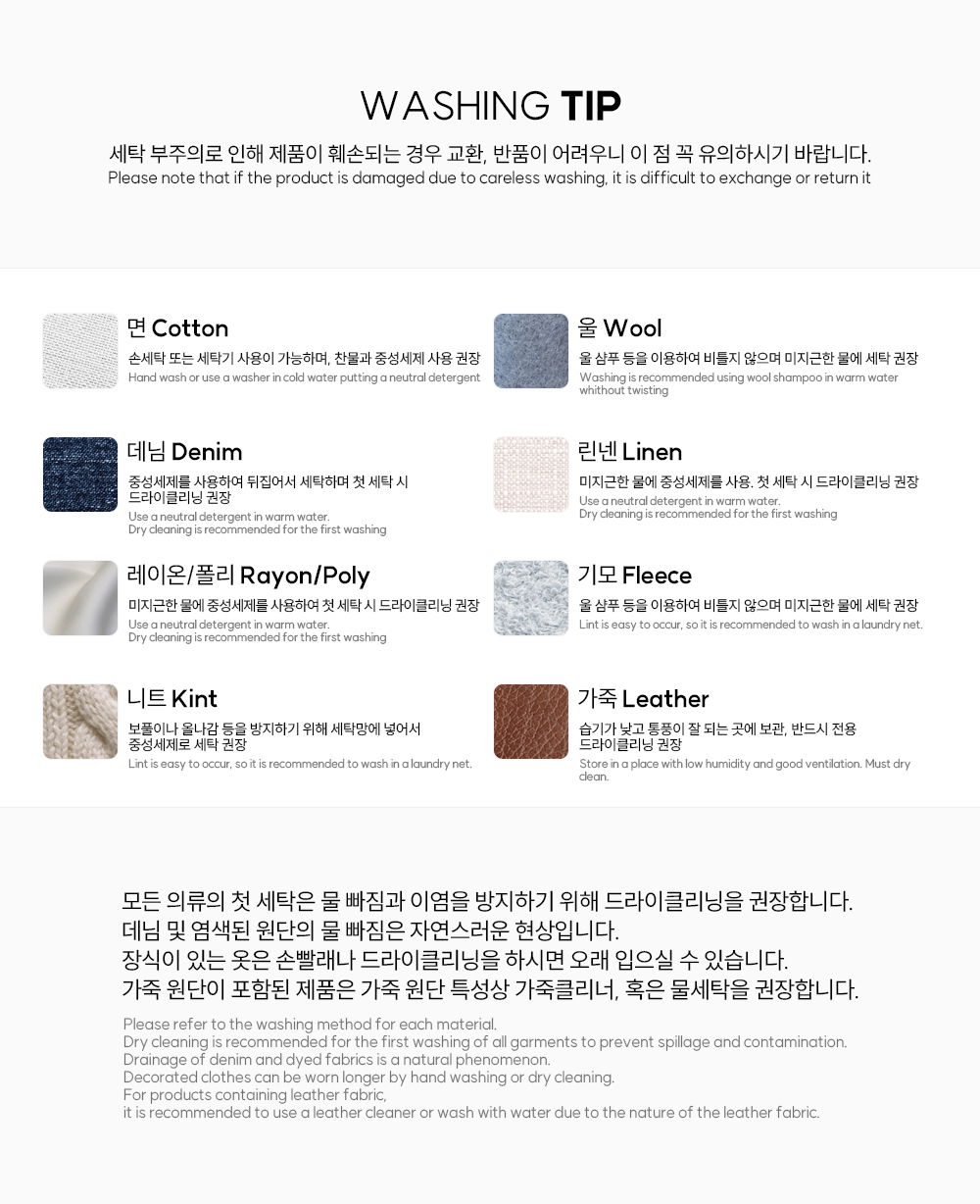 · 모든 의류의 첫 세탁은 드라이크리닝을 추천하며, 세탁 후 착용 부탁 드립니다.