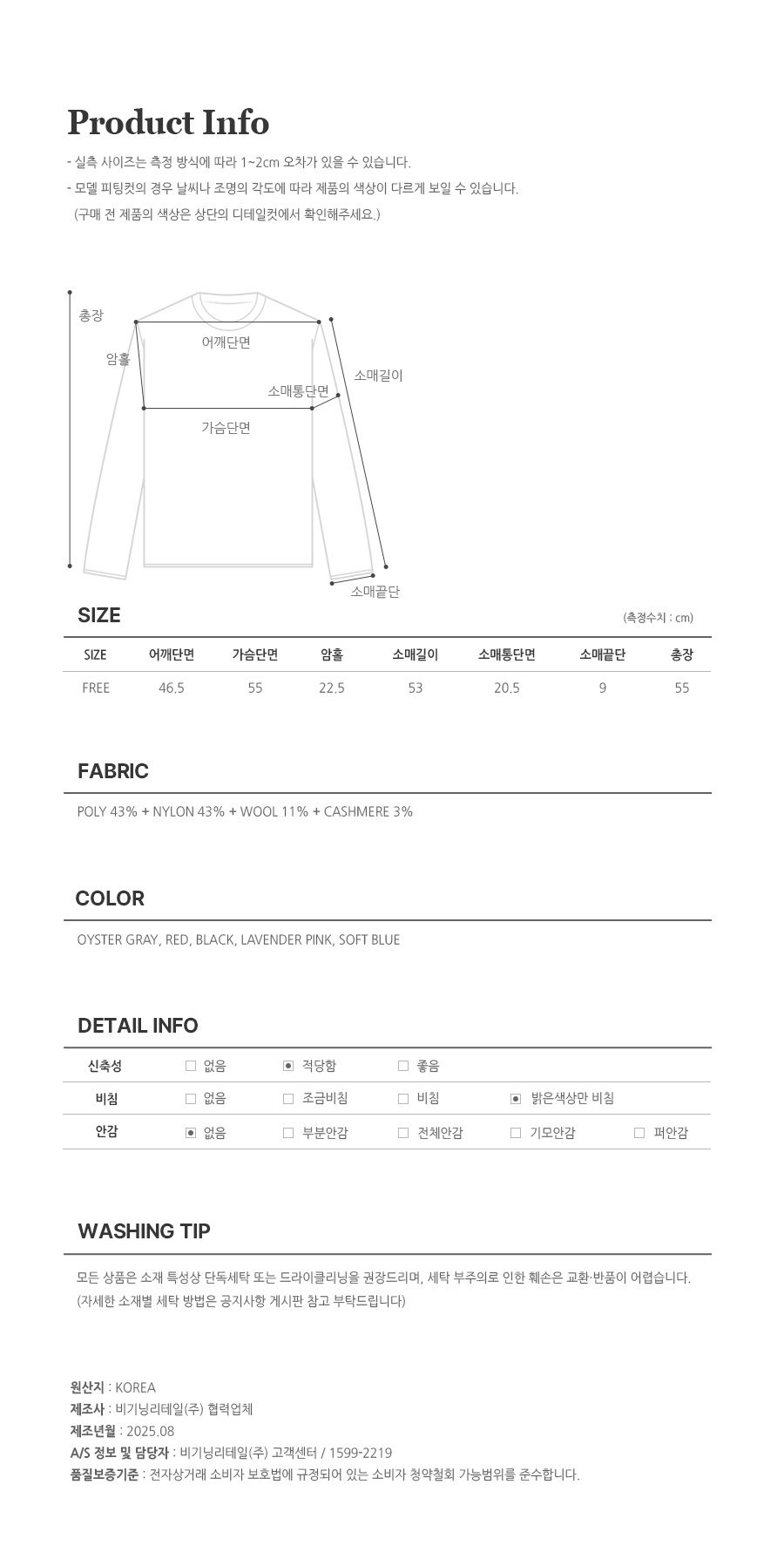 소재 : 폴리에스터 43%, 나일론 43%, 울 11%, 캐시미어