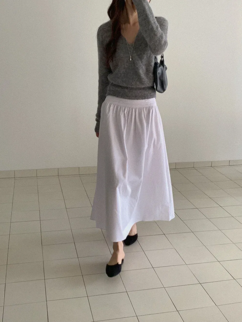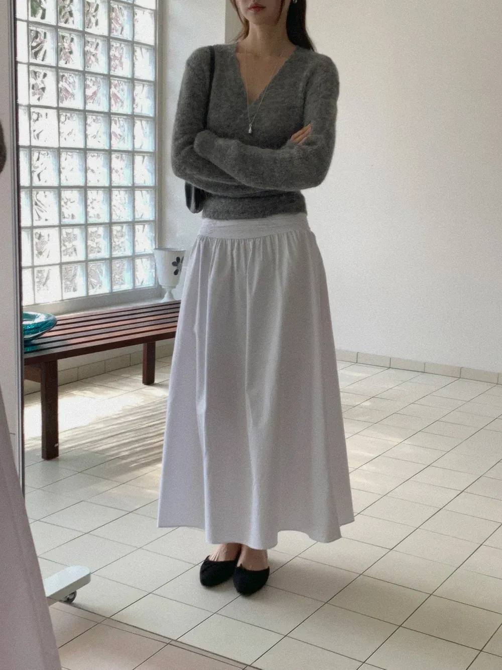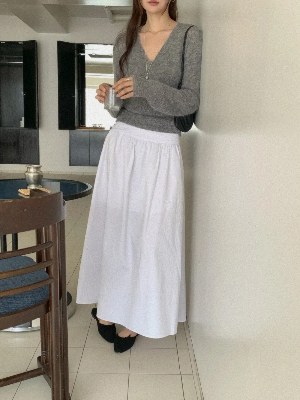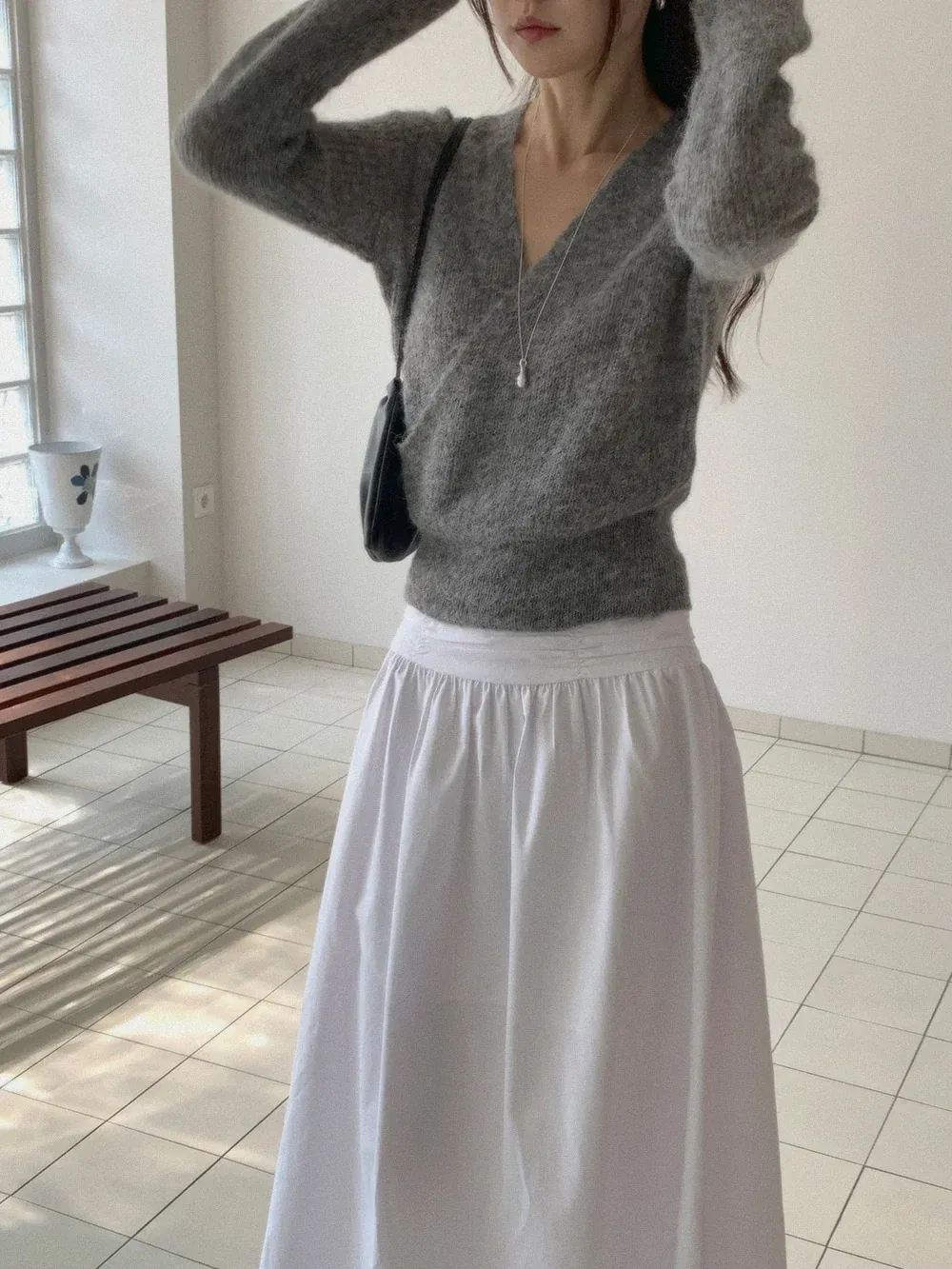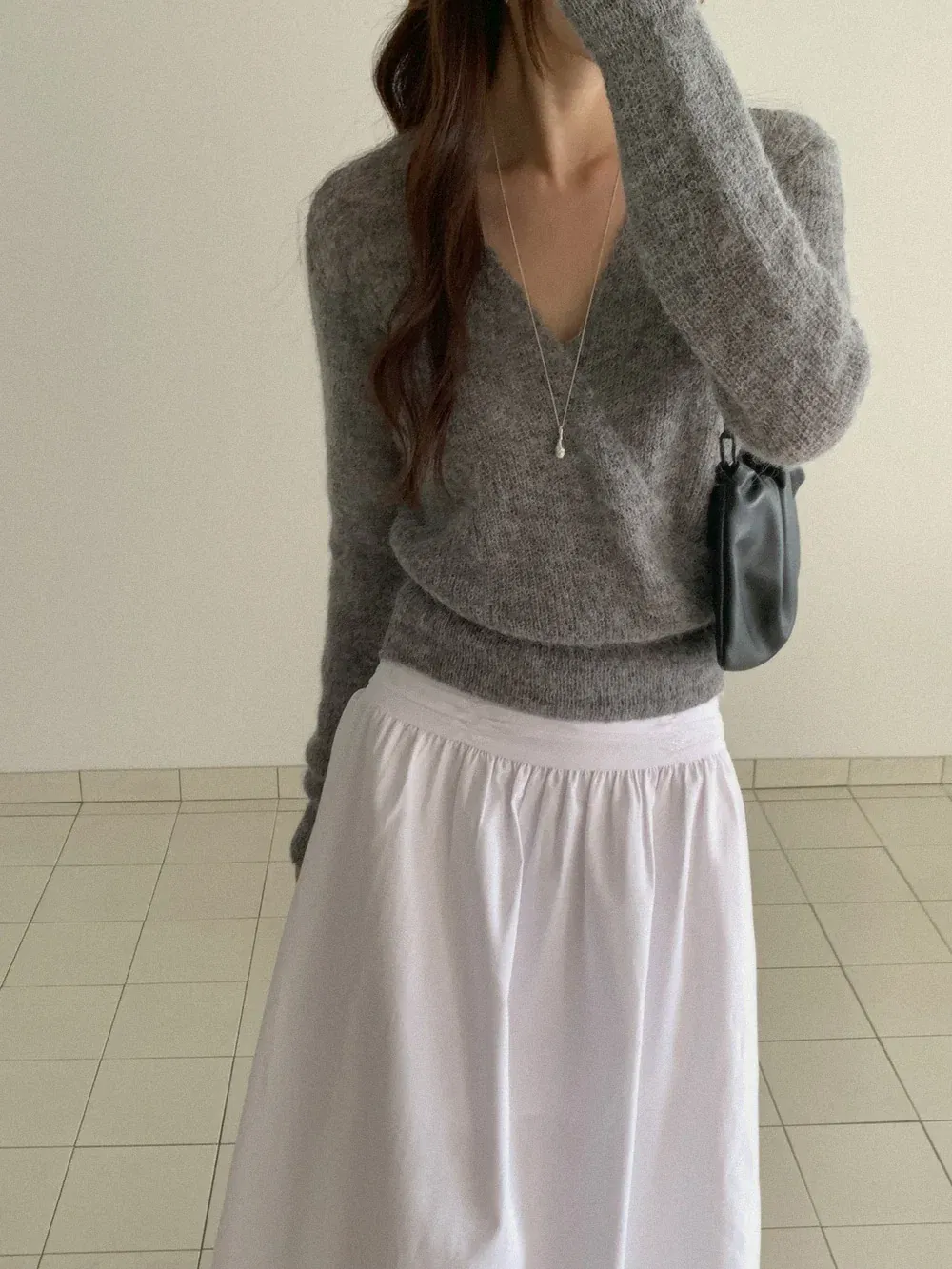 - 딥한 브이넥 네크라인으로 목선과 어깨선 강조