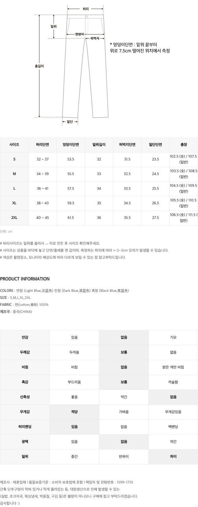• COLORS : 연청 (Light Blue,淡蓝色) 진청 (Dark Blue,深蓝色) 흑청 (Black Blue,黑蓝色)