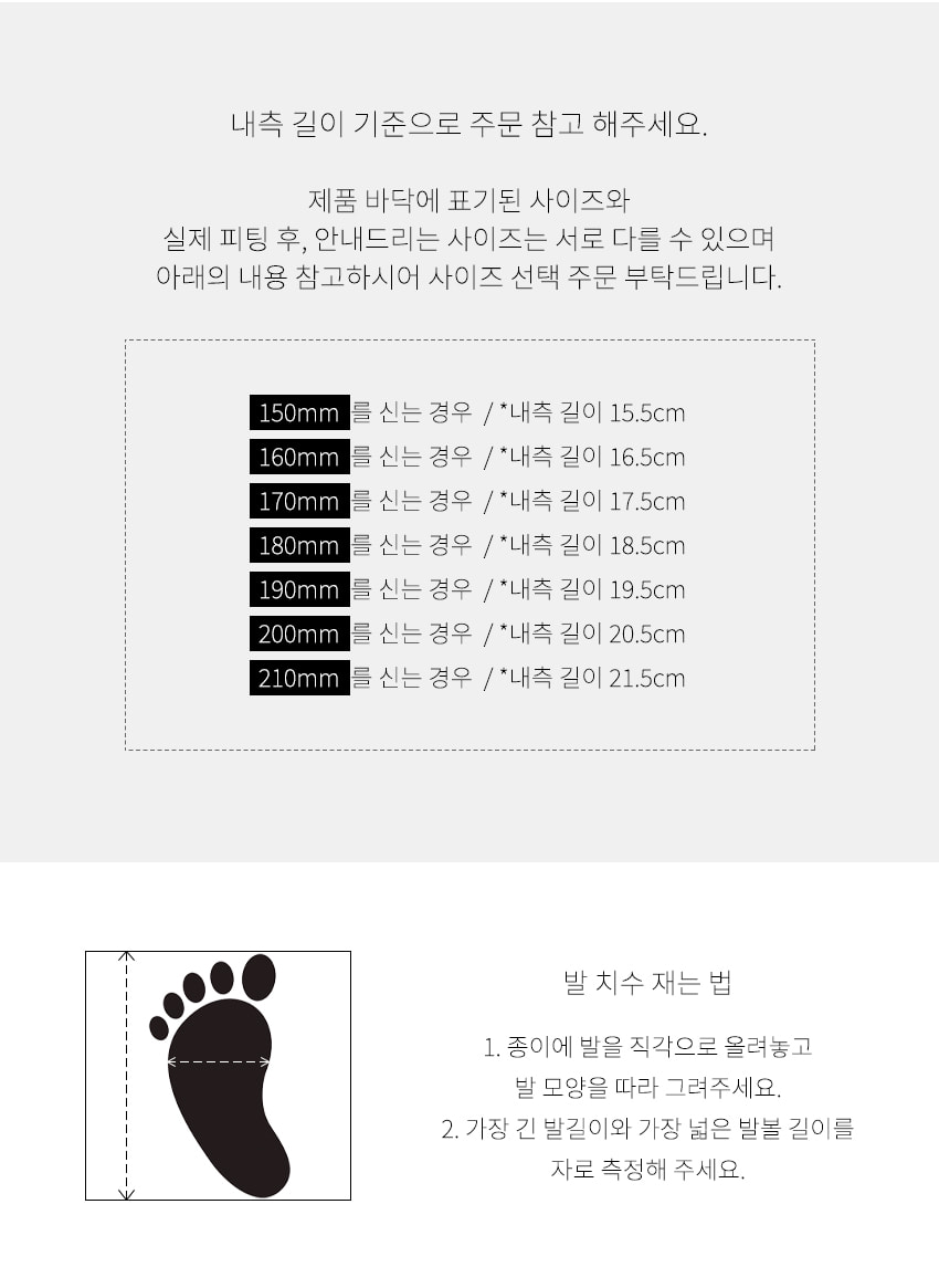 상품 상세페이지에 고시된 사이즈 정보를 참고하여, 평소 신는 신발과 실측 치수 비교를 추천드립니다.