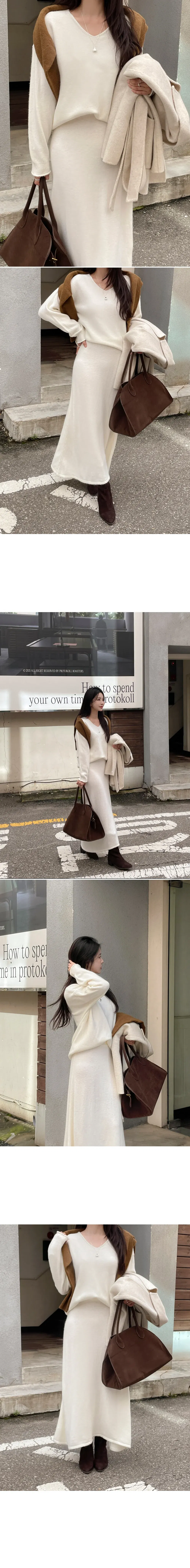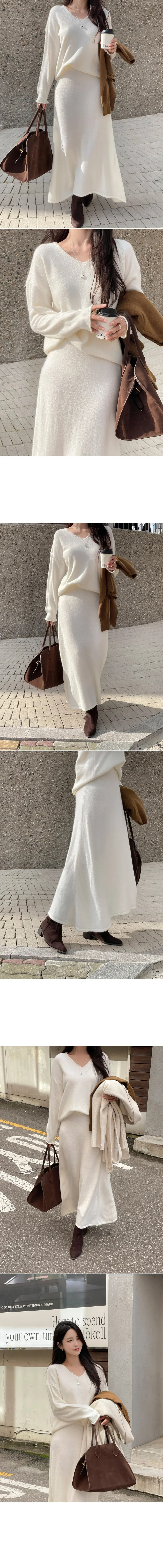 니트는 브이넥 라인으로 여리한 무드가