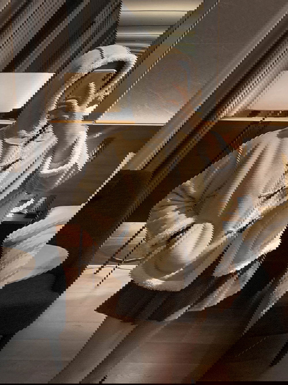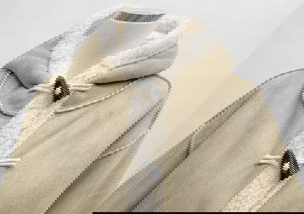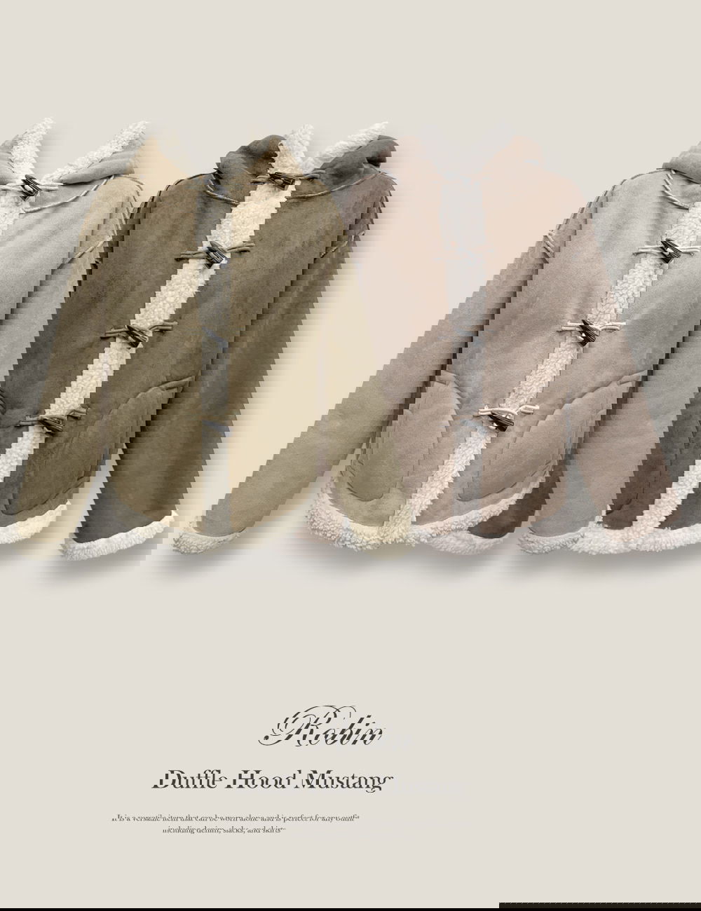 이 무스탕은 무스탕 특유의 최강 보온성에 더플 디자인과 후드를 더해서,