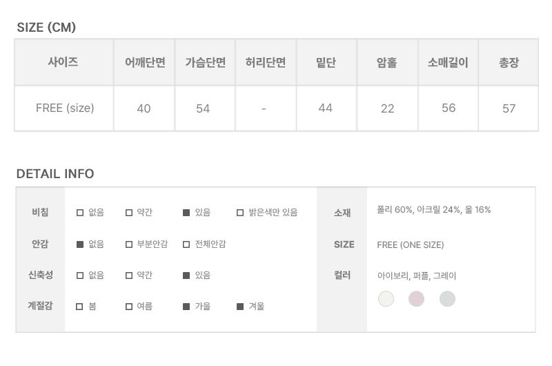 소재 : 폴리에스터 60%, 아크릴 24%, 울 16%
