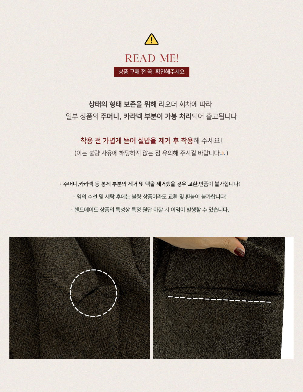 · 모든 의류의 첫 세탁은 드라이크리닝을 추천하며, 세탁 후 착용 부탁 드립니다.