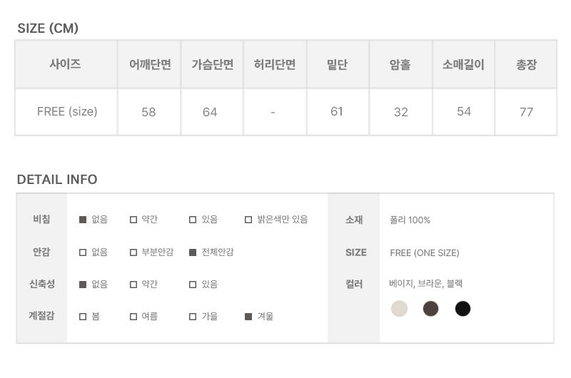 제품 측정 방법에 따라 1~3cm 오차가 발생할 수 있으며, 사이즈는 단면으로 측정됩니다