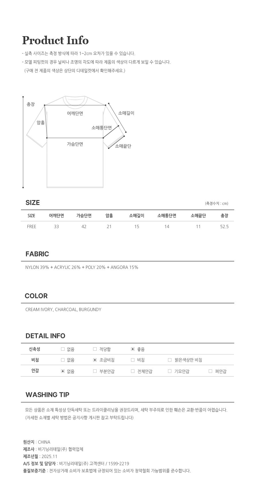 소재 : 나일론 39%, 아크릴 26%, 폴리에스터 20%, 앙고라