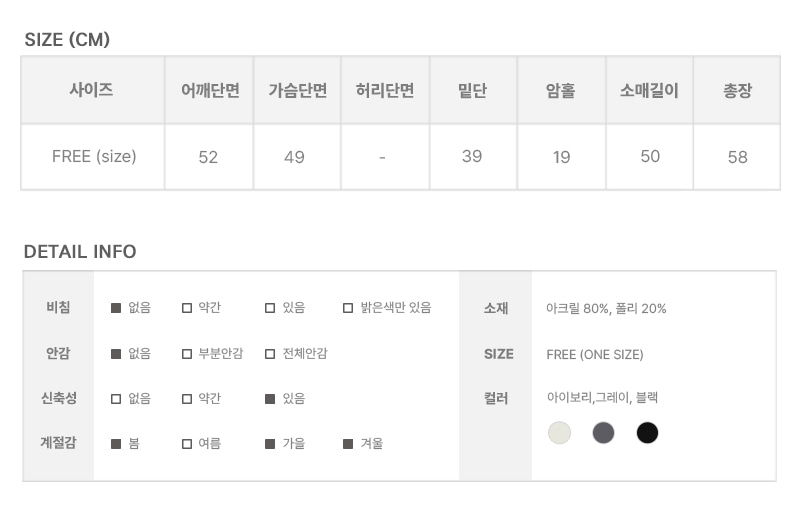 | 제품 측정 방법에 따라 1~3cm 오차가 발생할 수 있으며, 사이즈는 단면으로 측정됩니다 | ||||||